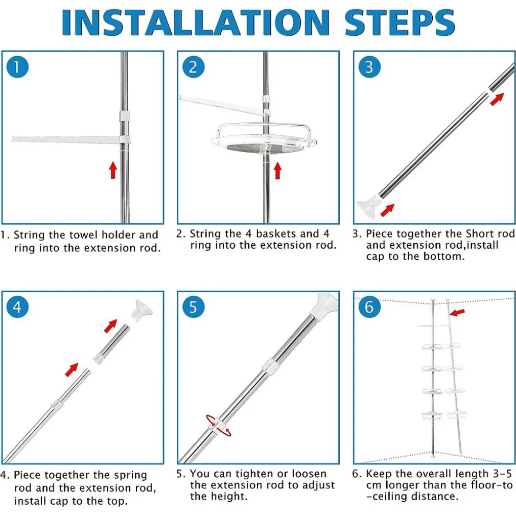 - Il ripiano per doccia è facile e veloce da montare senza attrezzi; L’estremità è una molla robusta, che consente al ripiano di stare in piedi saldamente e stabilmente. (La lunghezza totale del ripiano della doccia dovrebbe essere 3-5 cm più lunga della distanza dal pavimento al soffitto)