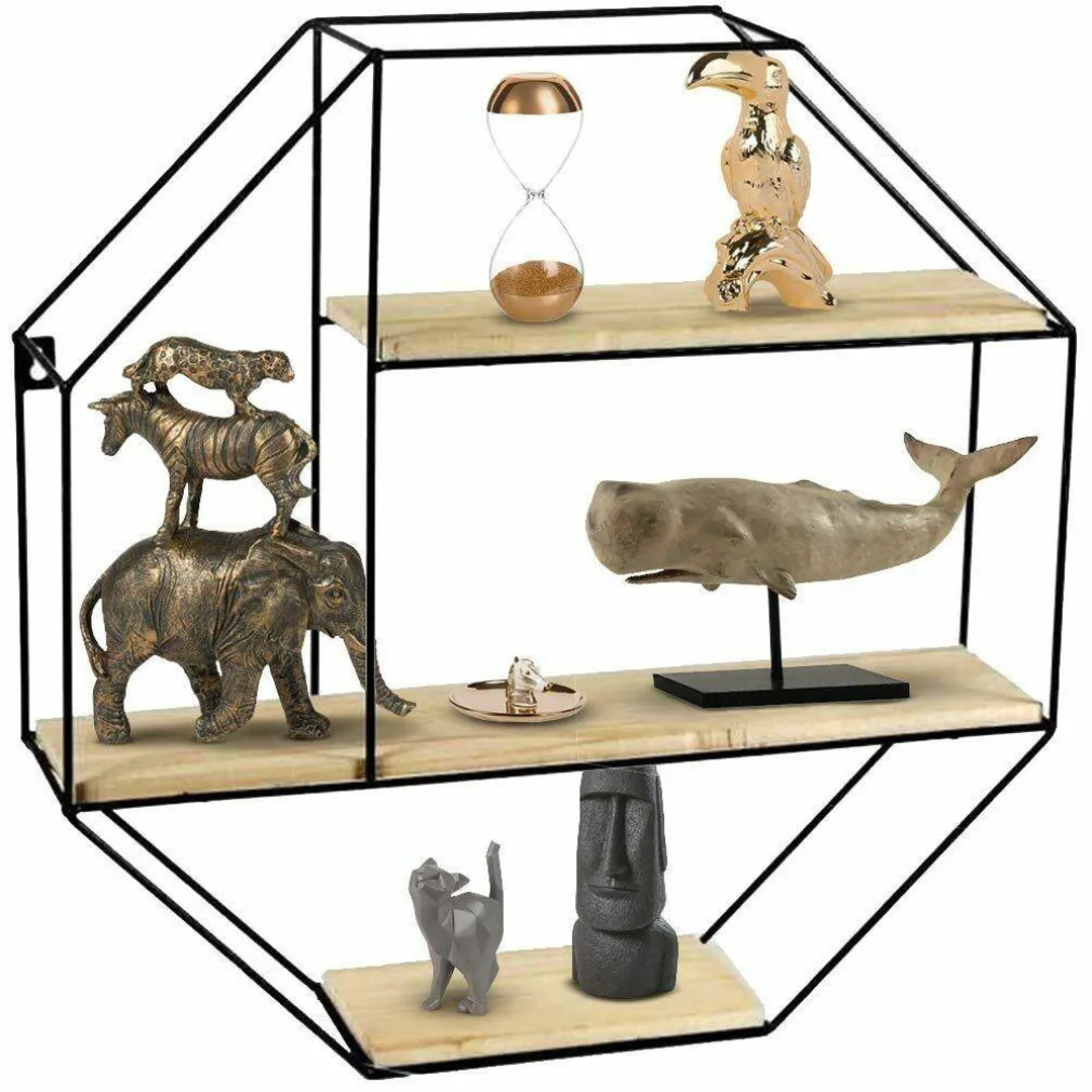 Mensola Parete Esagonale 3 Mensole Ripiani Design Moderno Scaffale Legno Metallo