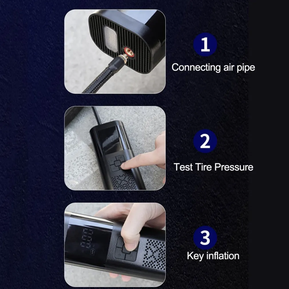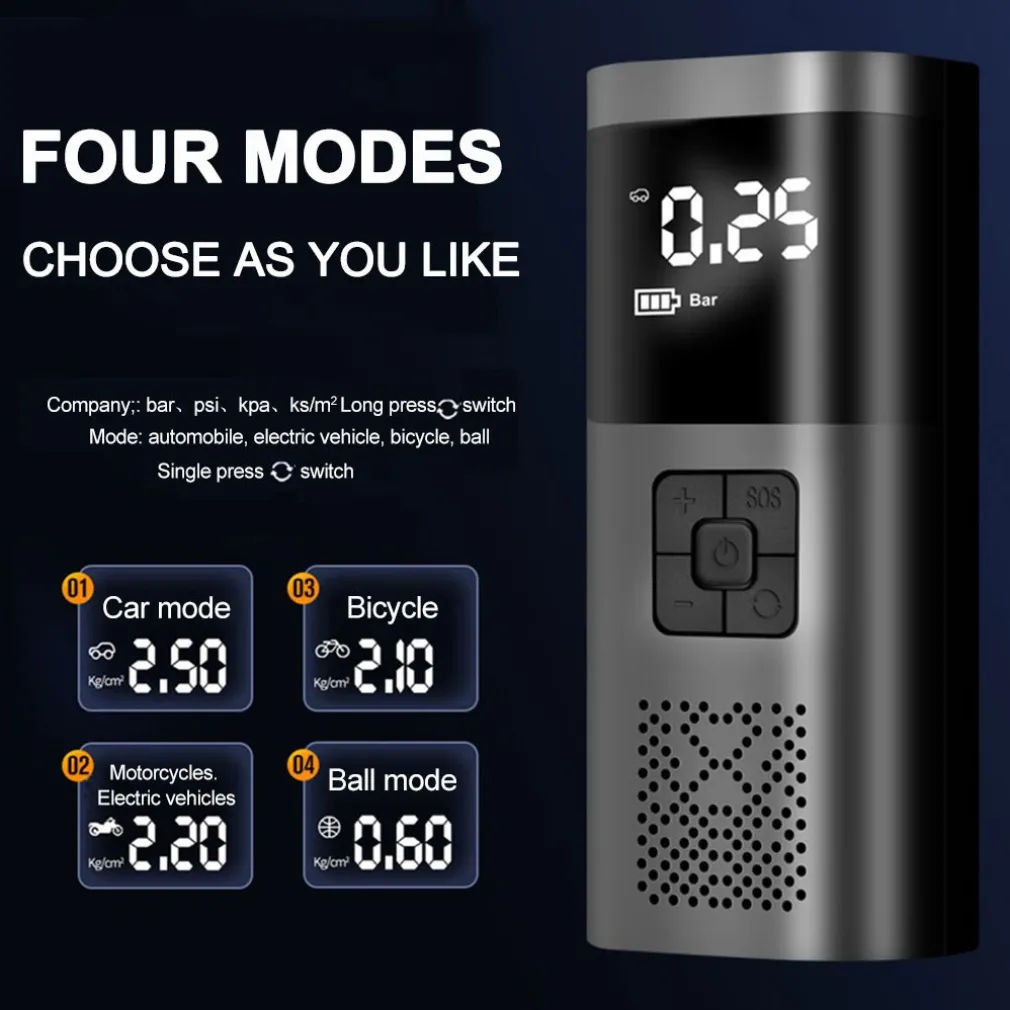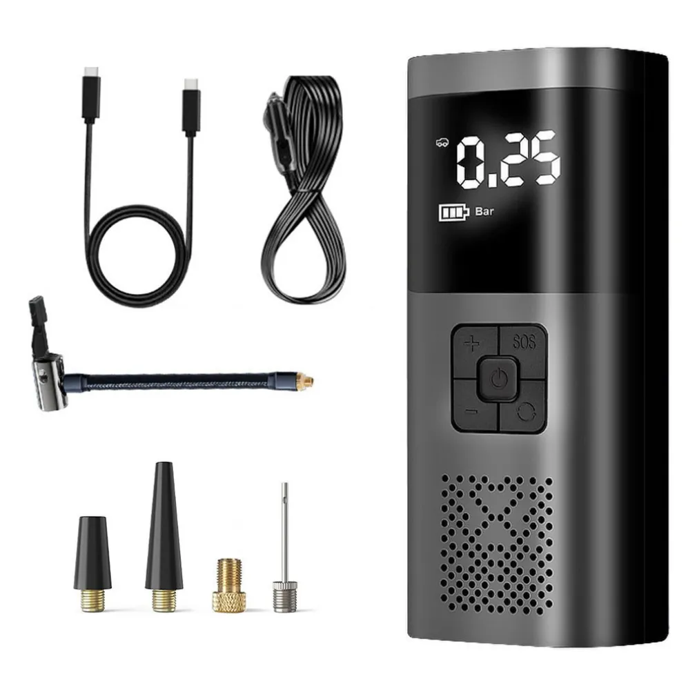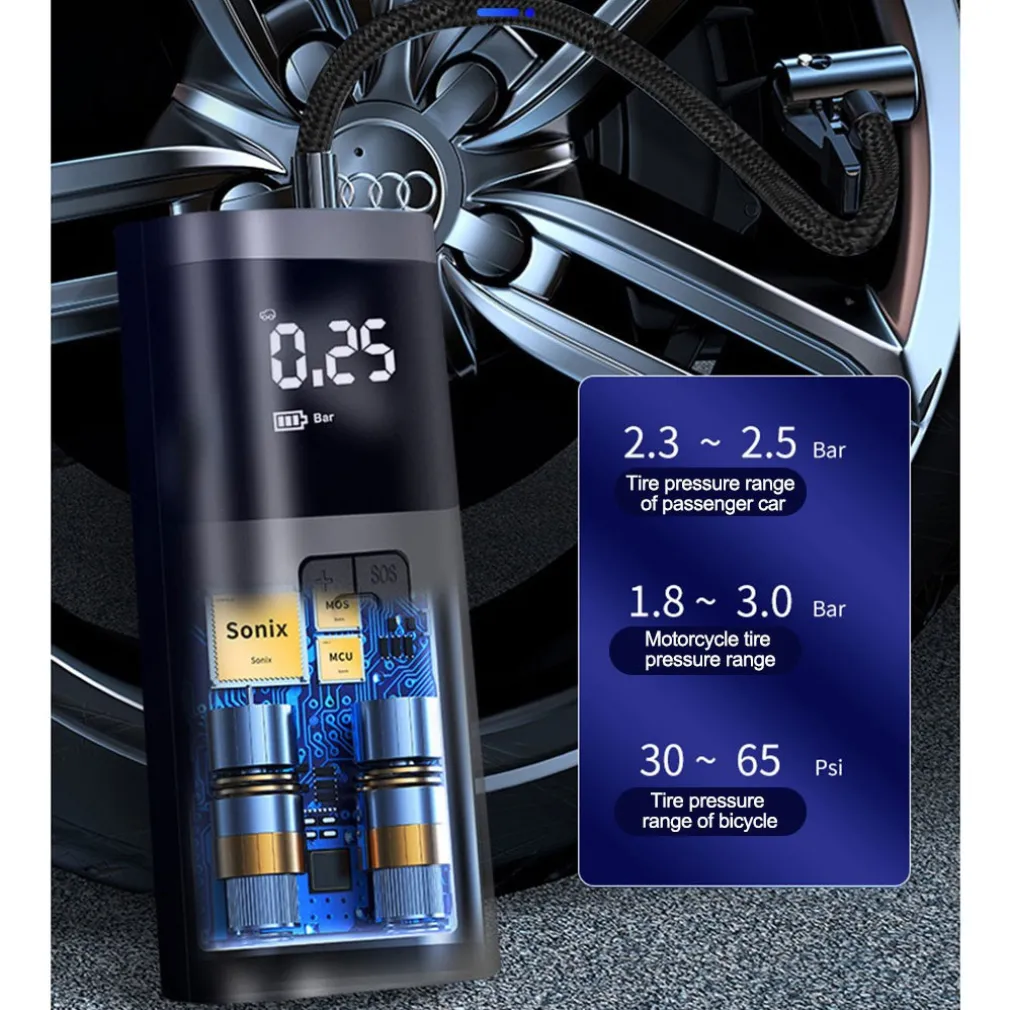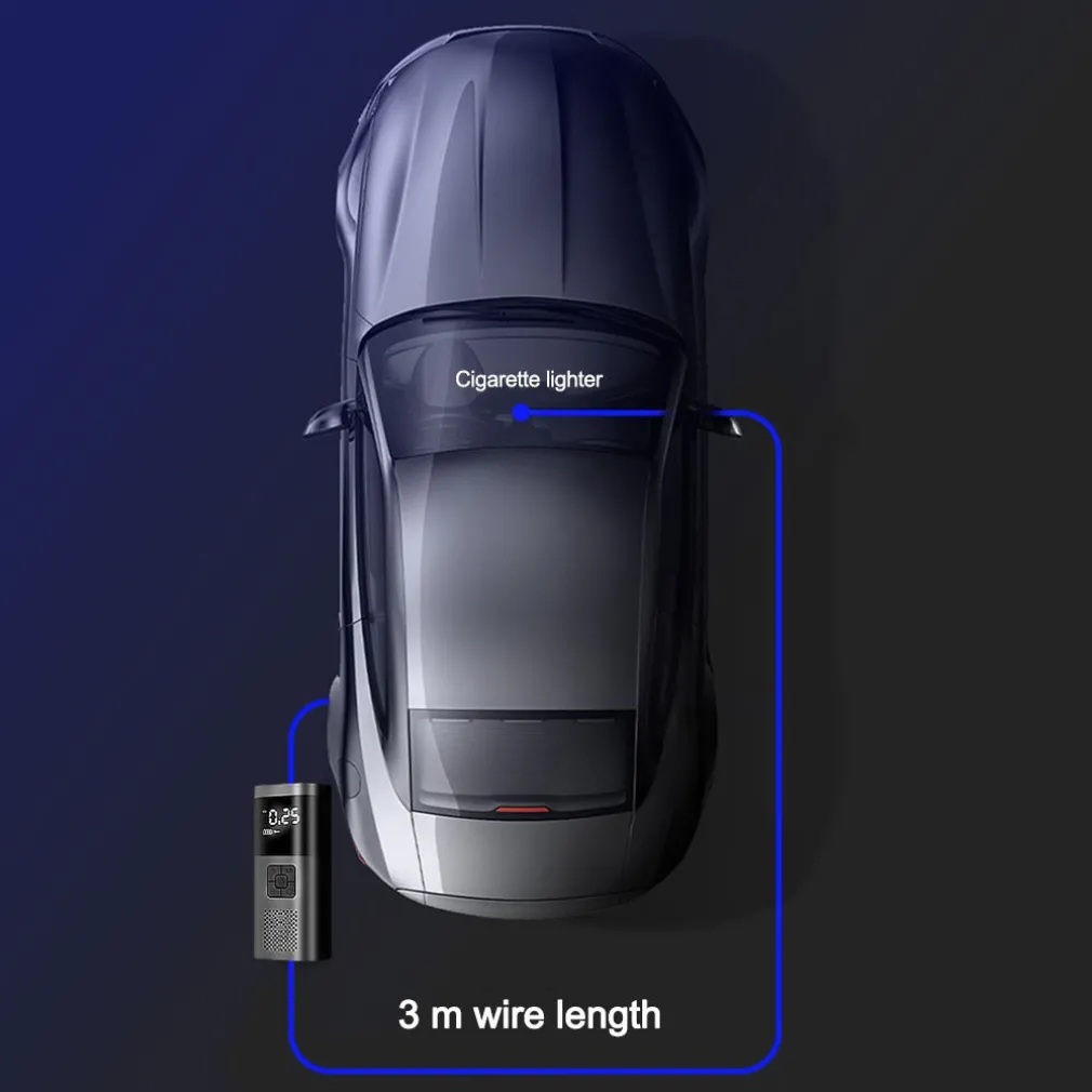 Questo pratico mini compressore elettrico della pompa d’aria ha una pressione massima di gonfiaggio di 150PSI. Collegalo alla presa 12V della tua auto e attacca il gambo alla valvola del pneumatico. Basta premere il compressore d’aria dell’automobile e farà tutto il lavoro per voi. Illuminazione notturna a LED: Il compressore della gomma elettrica ha 3 modalità di illuminazione a LED. Il display LCD digitale mostrerà 4 unità di pressione aria “PSI”, “BAR”, “KPA”, “Kg/m²”. Pompa di gonfiaggio senza fili del pneumatico di ricarica intelligente multifunzionale dell’esposizione digitale Materiale del prodotto: policarbonato (pc)+componenti elettronici Blocco cilindro: 19 cilindri monocilindrici