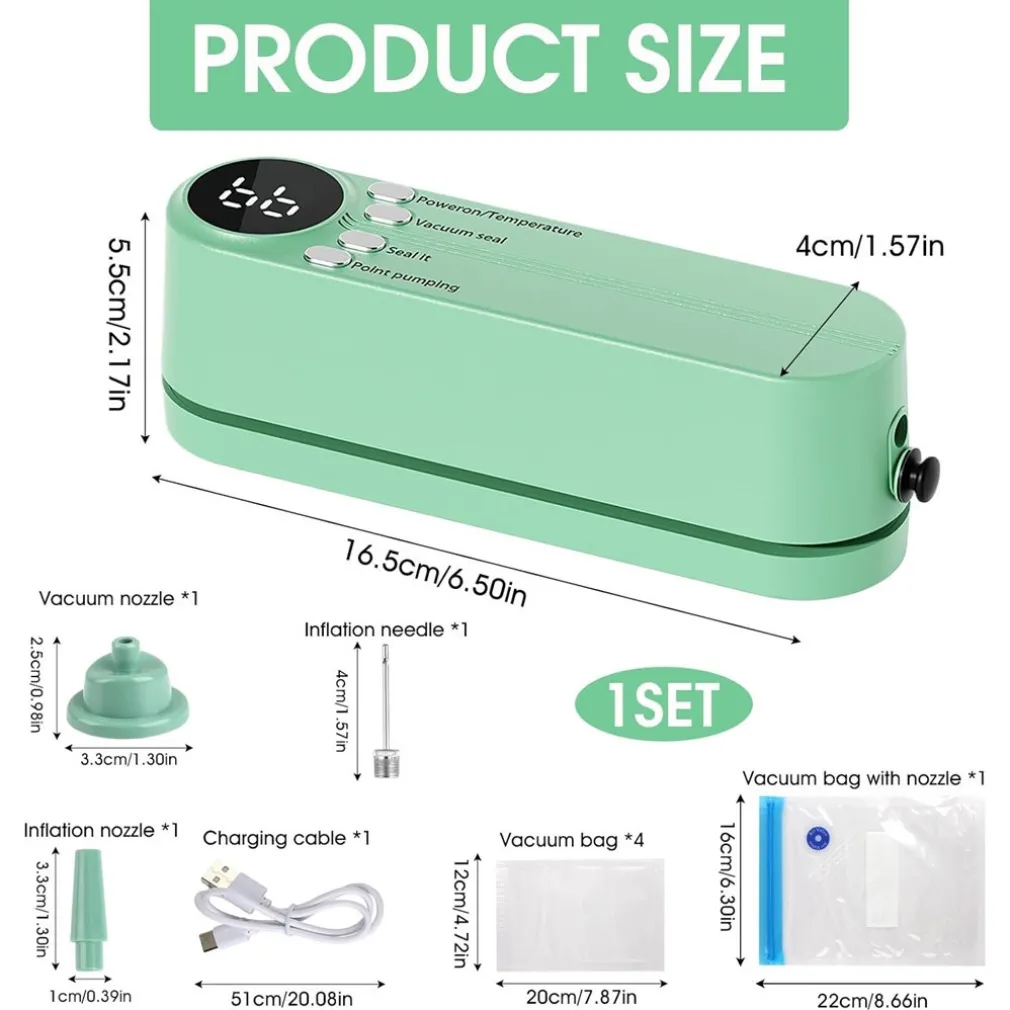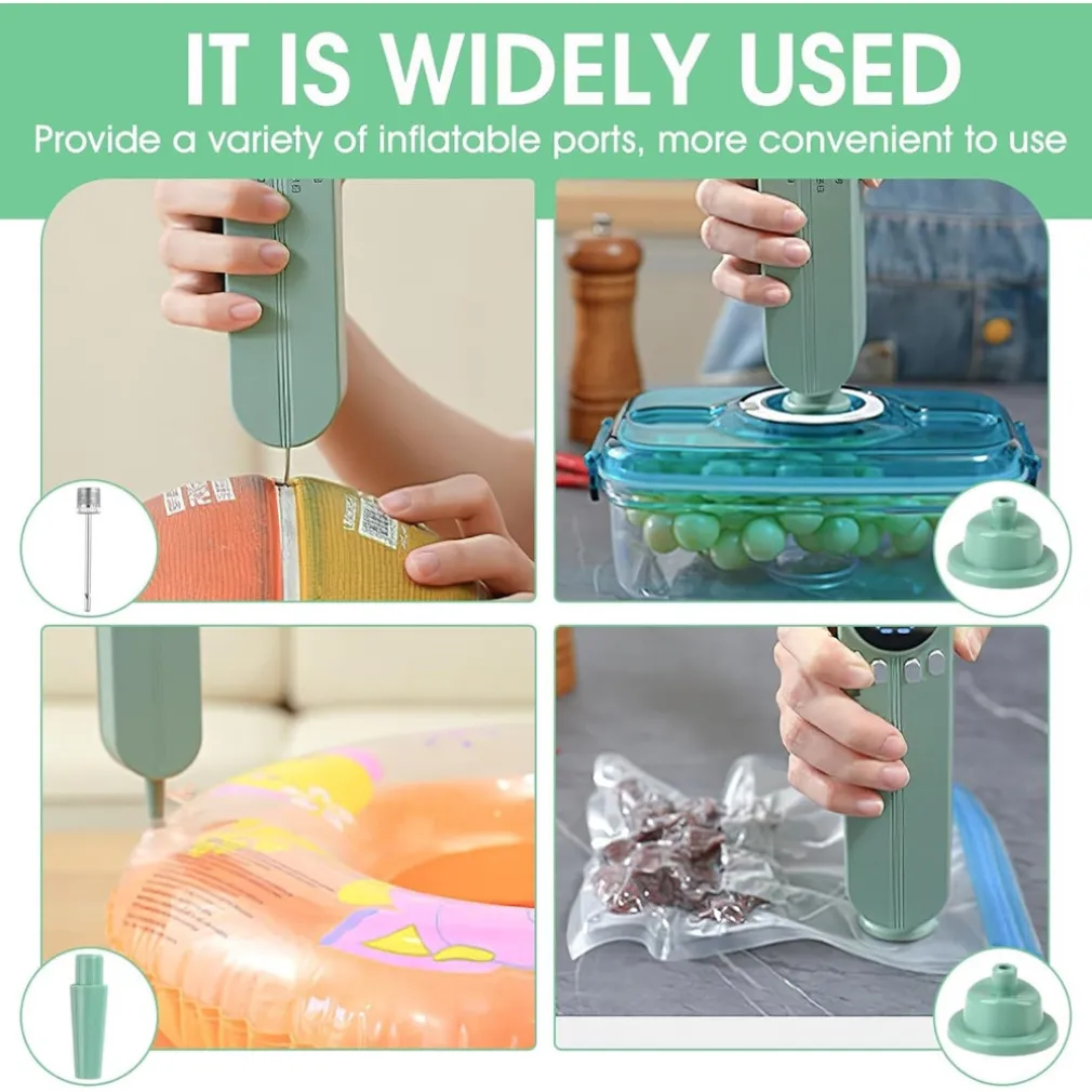 Offre funzioni 7 in 1: sigilla, aspira l’aria per conservazione sottovuoto, gonfia oggetti come palloni e protegge il cibo dal deterioramento. Adatto anche per chiudere snack o sacchetti alimentari.