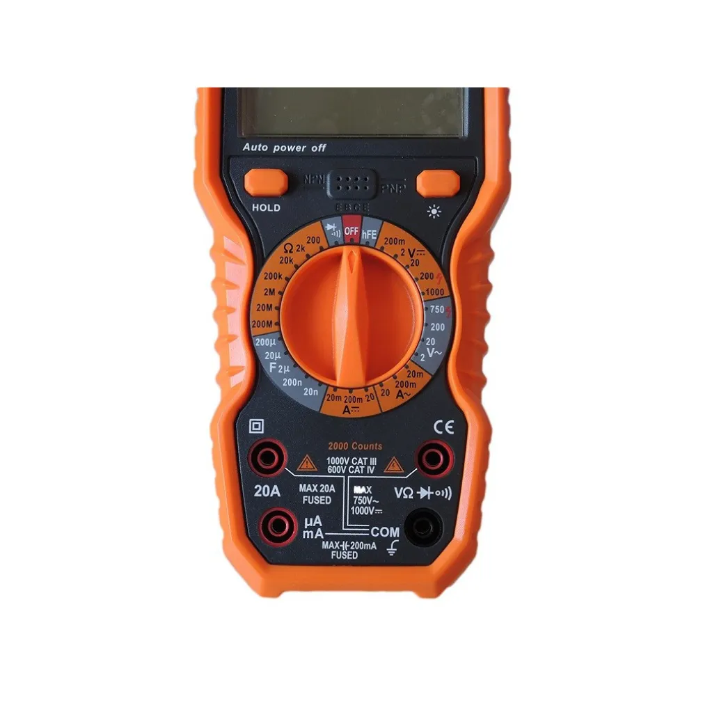 Tester multimetero digitale multifunzione ideale per quanto riguarda il campo dell’elettrica; prodotto indicato per elettricisti o per amanti del fai da te o per professionisti di altri settori come informatica ed elettronica, ma anche meccanica ed elettrauti. Misura IL VOLTAGGIO DC e AC, corrente AC e DC, resistenza, diodi, transistor, frequenze, temperature, capacità e continuità. Dotato di un display LCD retroilluminato. Dotato di sistema di spegnimento automatico. Guscio anti urto in gomma con supporto da tavolo e potente calamita integrata.