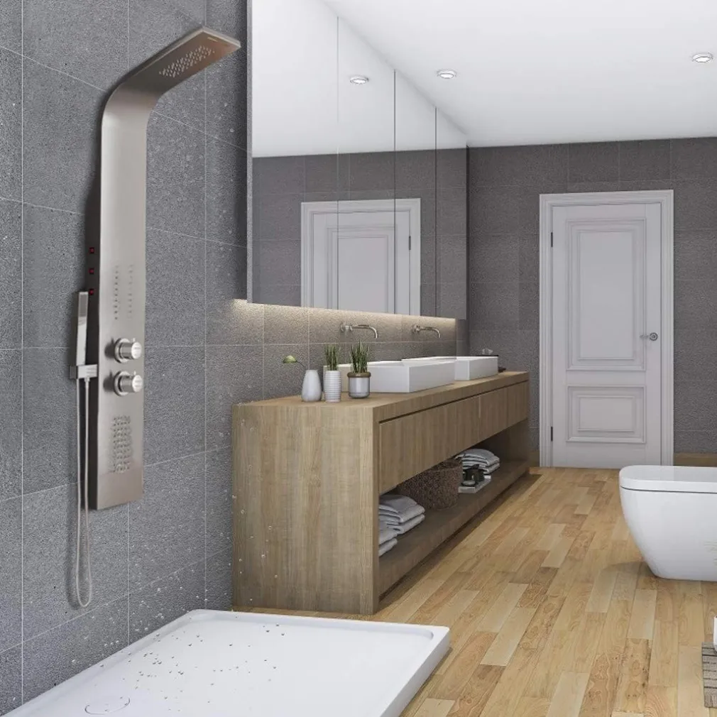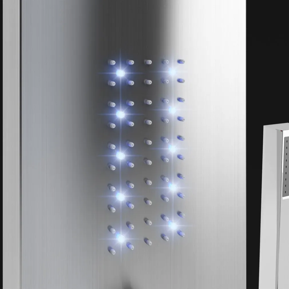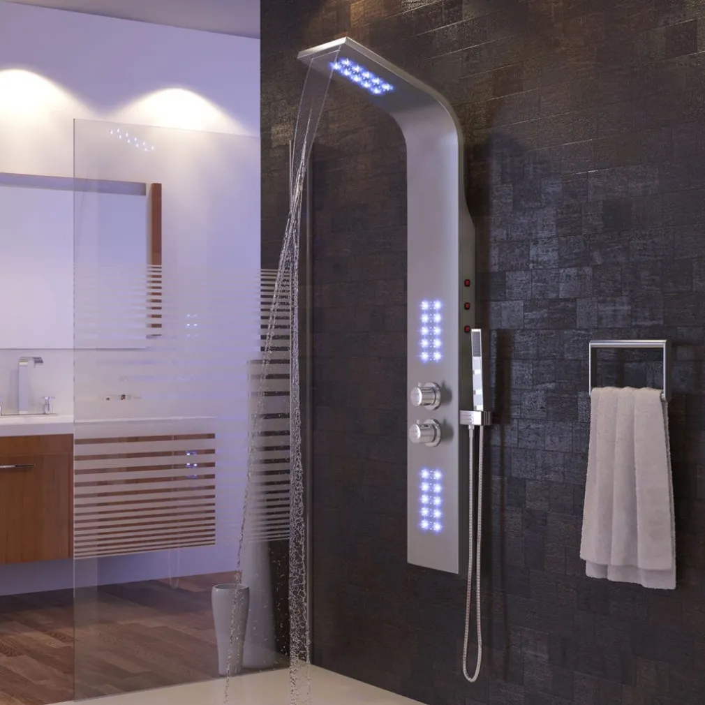 l futuristico pannello doccia con la sua suggestiva bellezza è l’incontestata attrazione del vostro bagno. Il sistema doccia si propone come un concentrato di piacere e benessere: una doccia a pioggia inclusa cascata, una doccetta manuale con tubo flessibile in acciaio inox e ugelli da idromassaggio. I singoli elementi di erogazione dell’acqua, nonché la potenza del getto e la temperatura possono essere comodamente regolati con le apposite manopole. La combinazione degli elementi doccia è maneggevole e facile da pulire, gli ugelli sono auto-disincrostanti. I supporti e gli attacchi standardizzati ne rendono facile il montaggio. Concedetevi una benefica pausa sotto il confortevole pannello doccia.