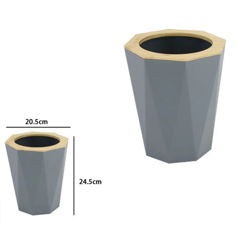 Pattumiera bagno grigio con finiture in legno, dalle linee geometriche e forma esagonale, perfetta per ambienti in stile nordico e contemporaneo. La sua estetica pulita e tridimensionale si adatta a qualsiasi stanza, valorizzandola con discrezione ed eleganza. Le dimensioni compatte (20,5×24,5 cm) la rendono ideale anche per spazi ridotti, senza rinunciare alla capienza.