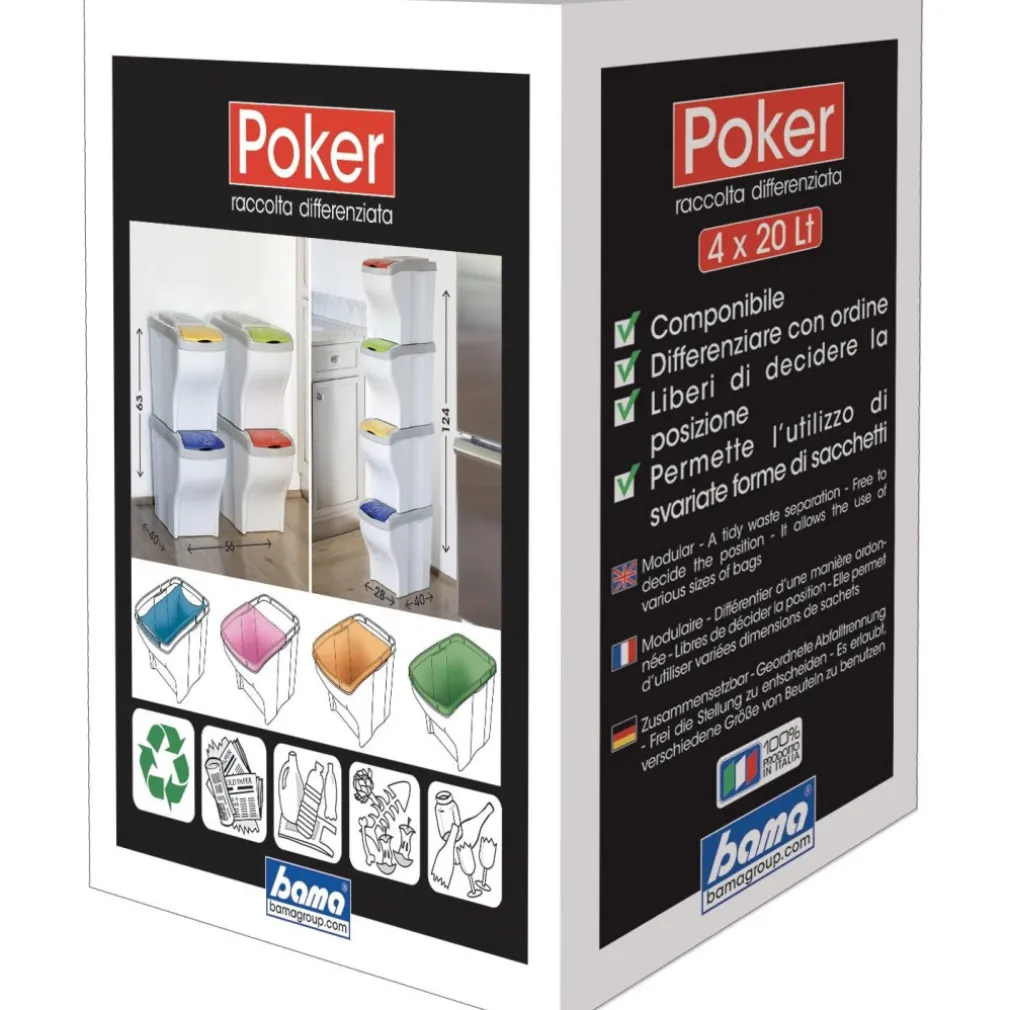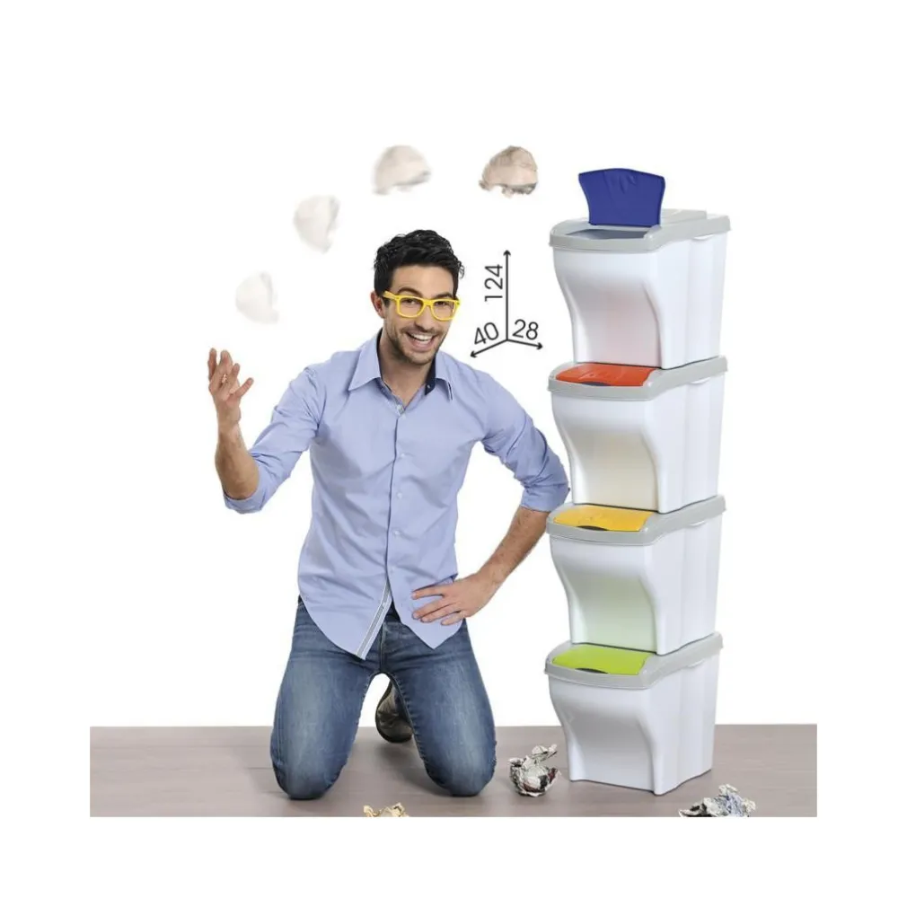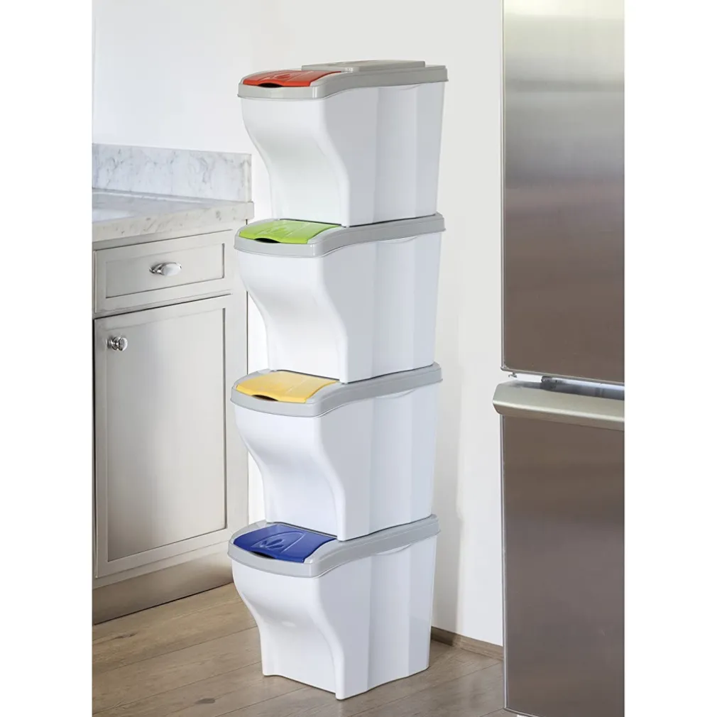 La pattumiera ha una capacità totale di ben 80 litri suddivisi in 4 scomparti da 20 litri, ogni scomparto è dotato di un comodo coperchio, inoltre ogni spazio è caratterizzato da un codice colore che permetterà a tutti i membri della famiglia di individuare il contenitore giusto per ogni tipo di rifiuto.