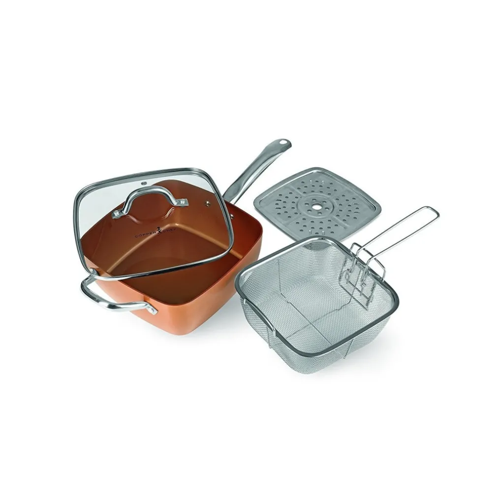 L’innovativa pentola 4 in 1 in rame e ceramica super resistente! Wok, casseruola, pentola da forno e friggitrice! Con set di 4 accessori! Include coperchio in vetro temperato, cestello per friggere e vassoio per cucina al vapore o al grill – Fondo idoneo anche per piano di cottura / fornelli ad induzione – padella chef quadrata rostiera con rivestimento in rame lucido micronizzato e ceramica antiaderente e manico in acciao kit pezzi ceramico colore cobre copper red pan pans