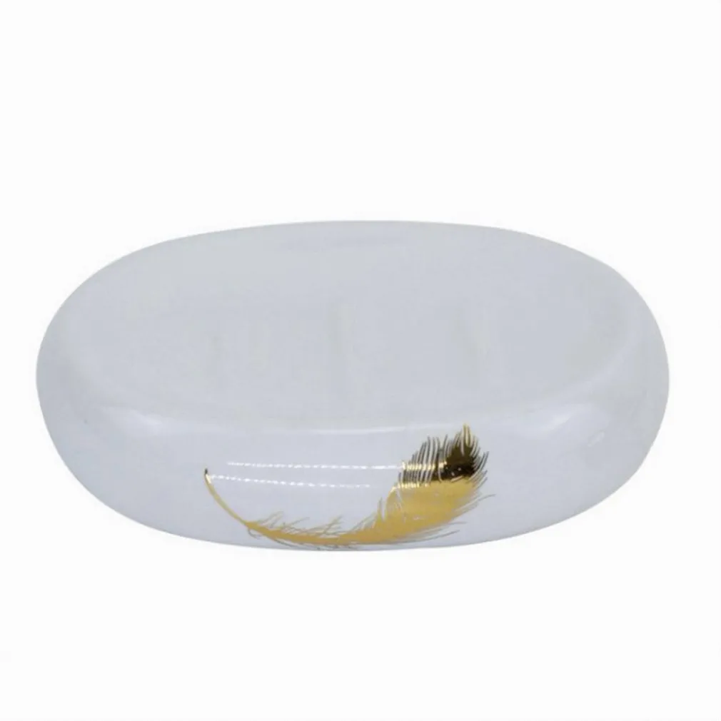 PIATTINO PER SAPONE IN CERAMICA BIANCA CON PIUMA ORO PORTASAPONETTA BAGNO 59896
