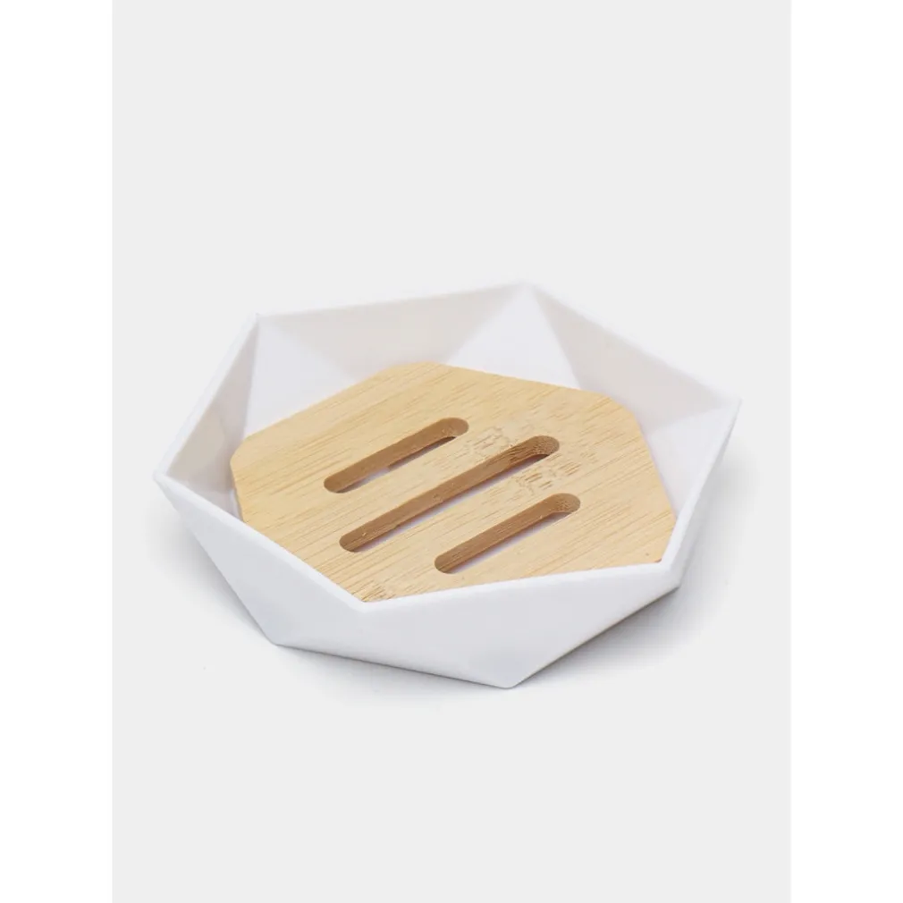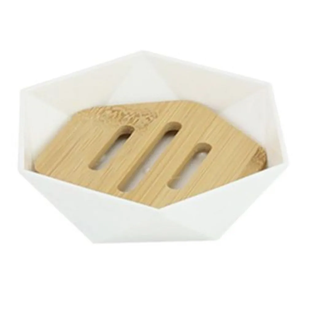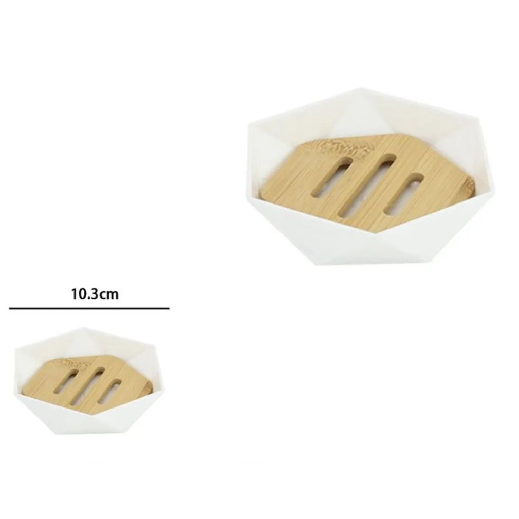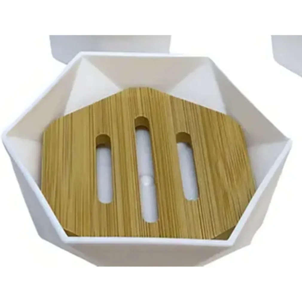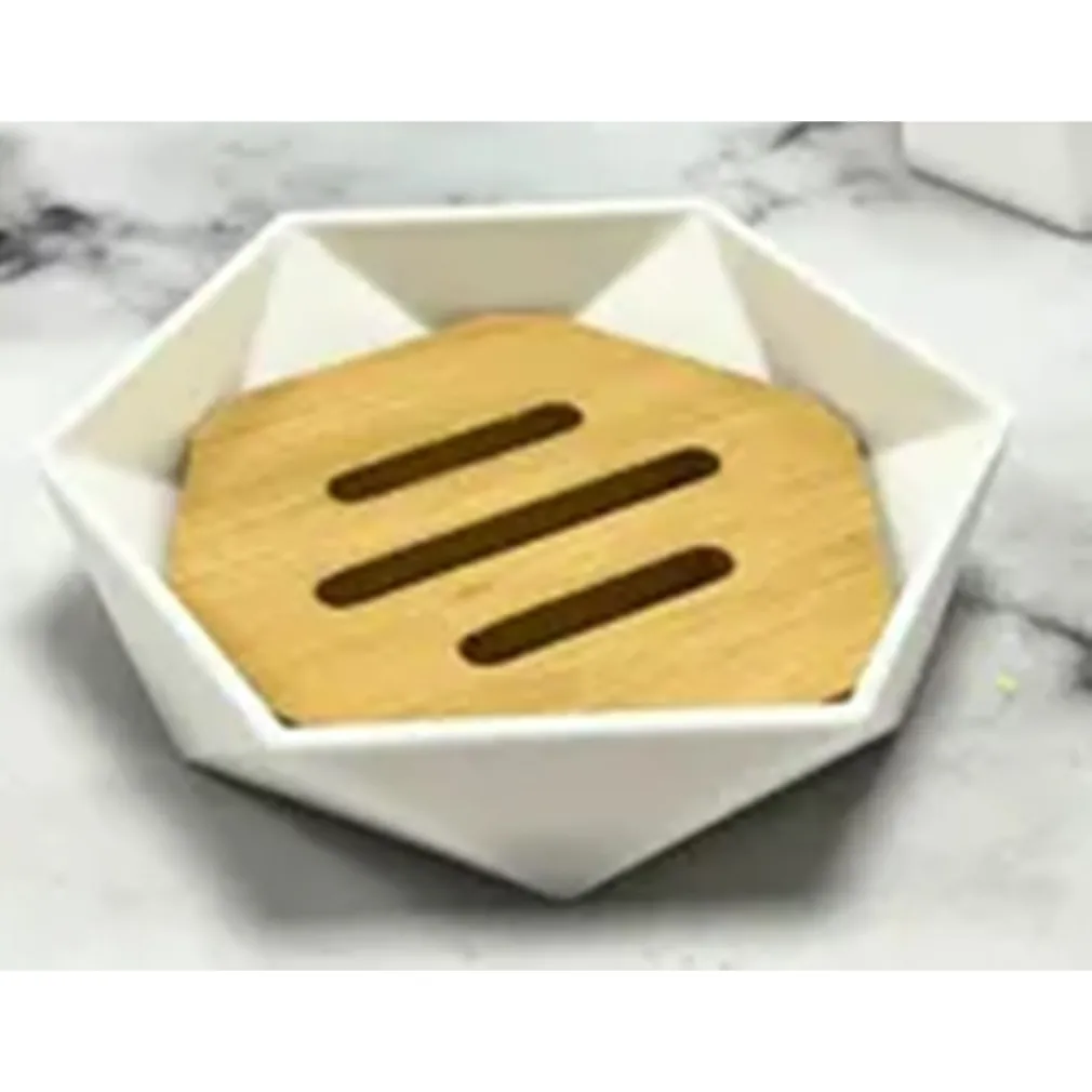 Porta Sapone Esagonale Geometrico Bianco e Legno – Design Moderno per un Bagno Elegante