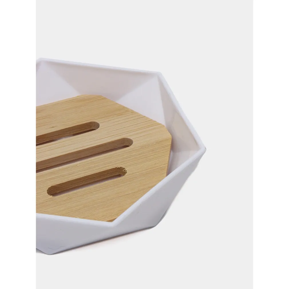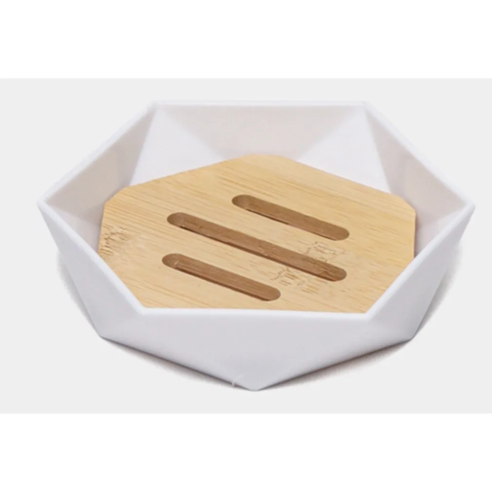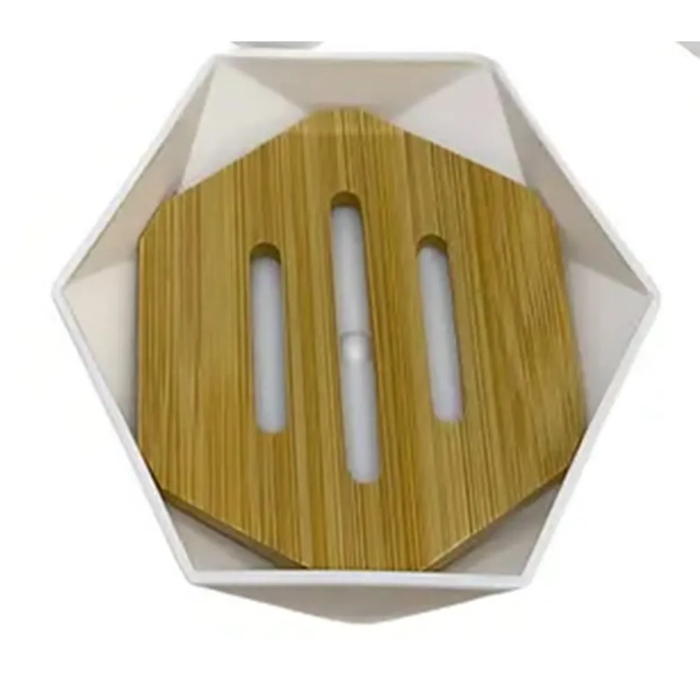 1 x piattino porta sapone esagonale in bianco e legno naturale