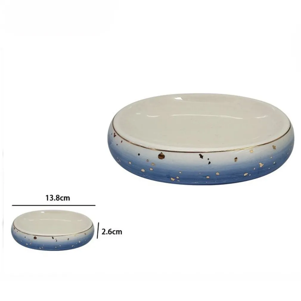 Il nostro esclusivo piatto piattino porta sapone saponetta unisce funzionalità e stile in un’elegante soluzione per il tuo bagno. Realizzato in pregiata ceramica bianca e blu, il design raffinato con sfumature che vanno dal blu al bianco, arricchito da un bordo e schizzi dorati, aggiunge un tocco di lusso al tuo ambiente bagno.