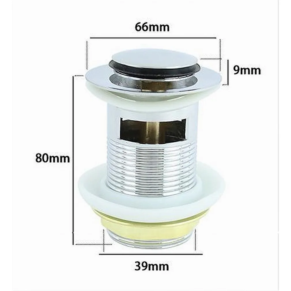 La piletta ha un’altezza di 85 mm quando il tappo è aperto e 80 mm quando è chiuso. Il diametro del tappo a pressione è di 30 mm, mentre la base del tappo ha un diametro di 66 mm. Il foro filettato ha un diametro di 39 mm.