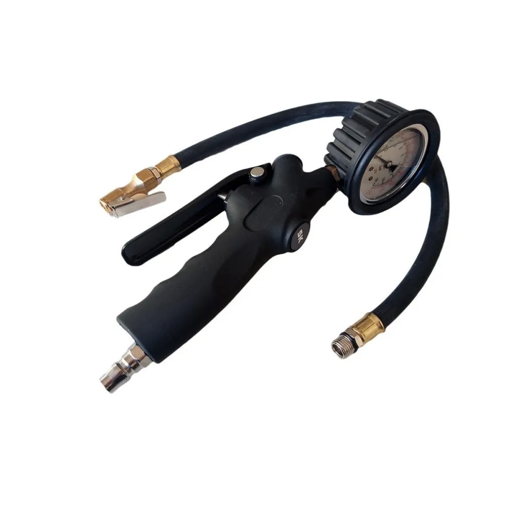 Manometro pistola per aria compressa dotata di manometro rivestito in gomma atossica, antiurto, con doppia scala di lettura: bar e psi. Inoltre nel manometro è presente liquido antishock per evitare sfarfallamenti della freccia di misurazione e per dare misurazioni precise anche in condizioni poco stabili e lunga vita al manometro. È indispensabile controllare sempre la pressione dei vostri pneumatici per ridurne il consumo degli stessi ma anche del carburante.