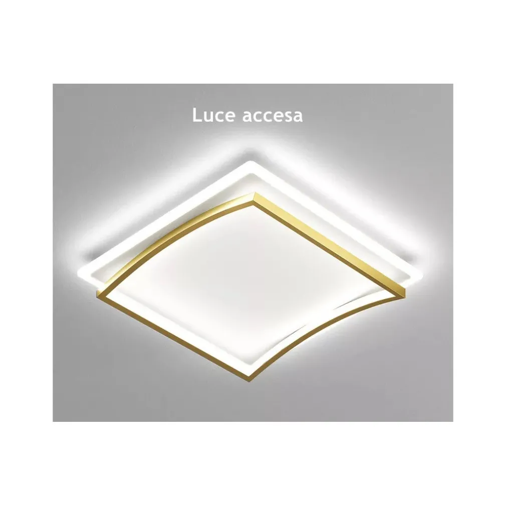 Il design minimalista e raffinato, con due quadrati sovrapposti oro e bianco, crea un effetto tridimensionale che aggiunge profondità e carattere agli ambienti interni. Realizzata in alluminio e PVC di alta qualità, questa plafoniera è la soluzione ideale per arricchire camere da letto, soggiorni, cucine, uffici, bar e ristoranti.
