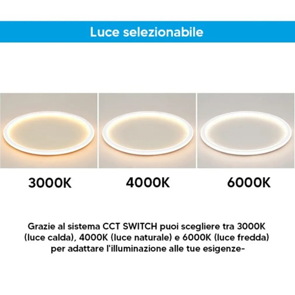 Temperatura colore selezionabile: 3000K (luce calda), 4000K (luce naturale), 6000K (luce fredda)