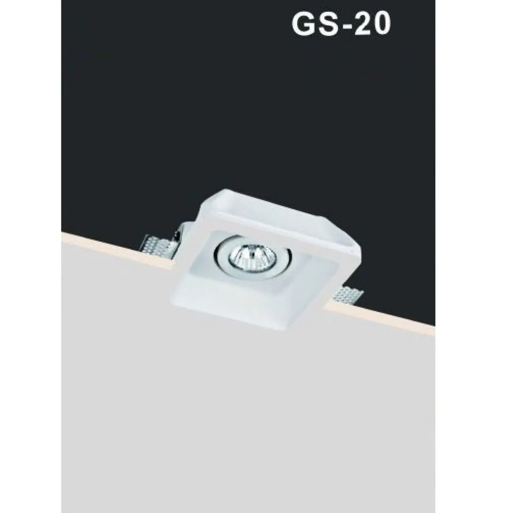 Faretto in gesso da incasso orientabile realizzato in gesso ceramico verniciabile e perfettamente integrabile con strutture e controsoffitti in cartongesso, forma quadrata con foro da incasso 160×160 mm, compatibile con lampadina GU10 (lampadina non inclusa).