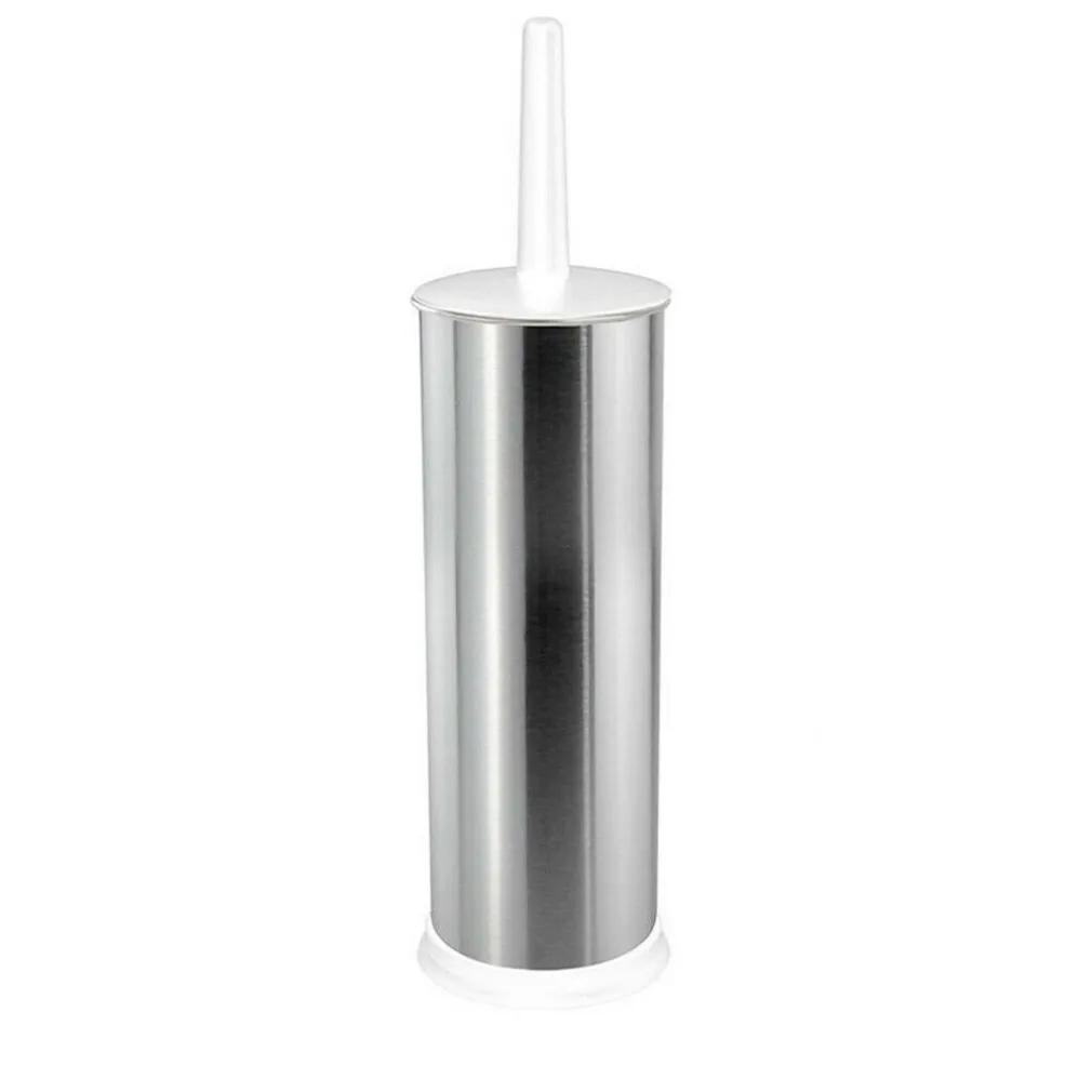 Porta Scopino a cilindro in acciaio satinato e con manico da avvitare al coperchio in plastica bianca abbinato alla base, ideale per arredare il vostro bagno in stile moderno. Il manico va avvitato alla spazzola e al coperchio.