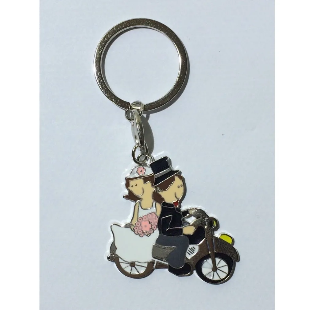 Portachiavi sposi Bomboniere matrimoni, promesse. Portachiavi con sposini in moto. Ideali come bomboniere per promesse o matrimoni. Misura: 5cm.