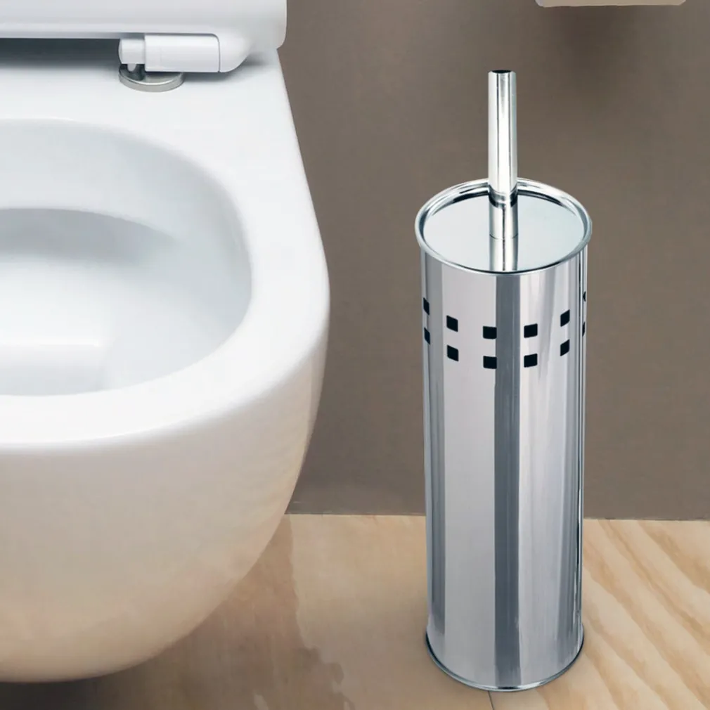 Bellissimo portascopino a cilindro con scopino in acciaio inox dal design semplice e minimale che darà un tocco speciale al tuo bagno.