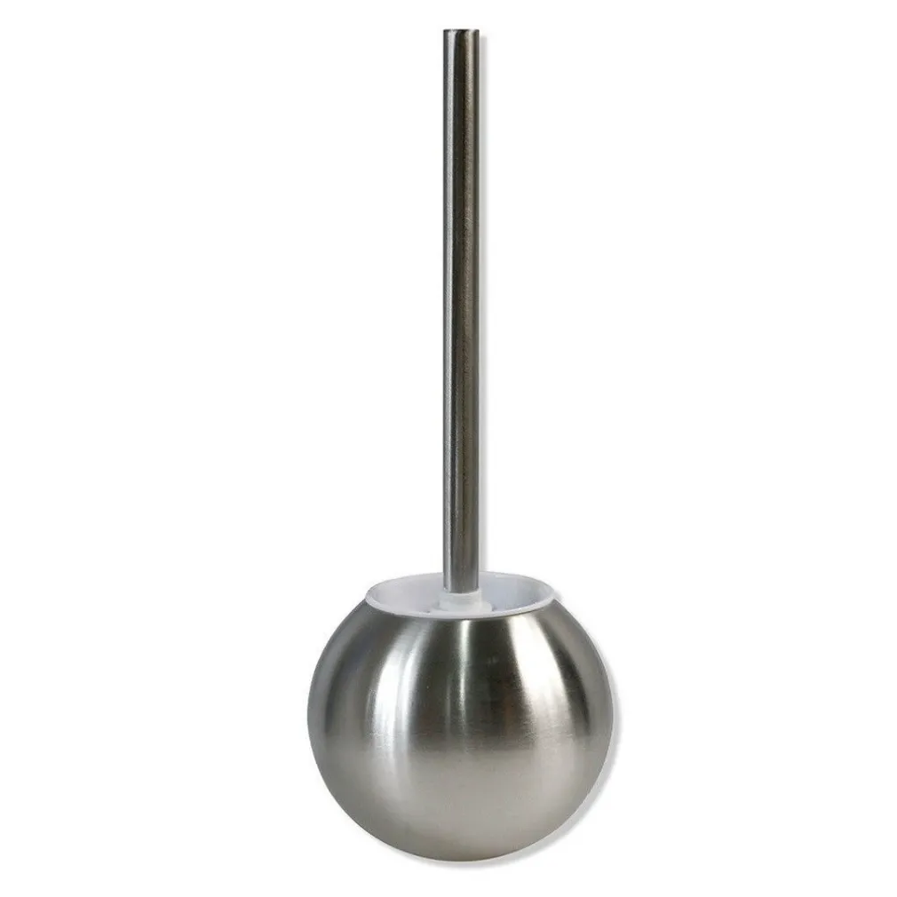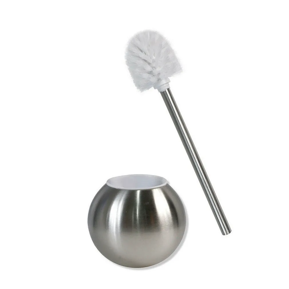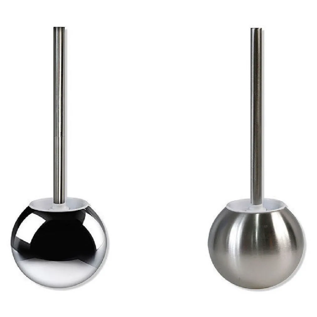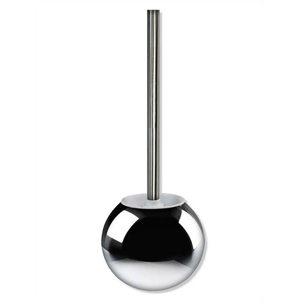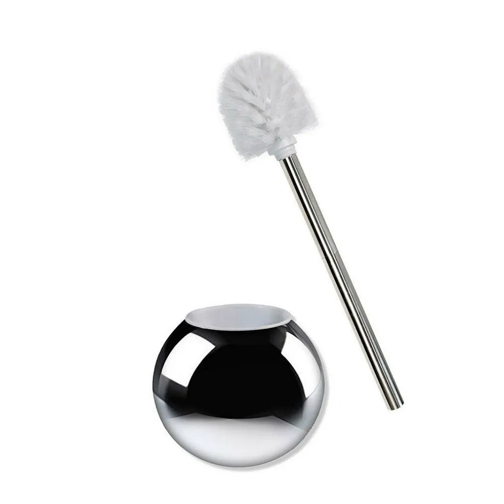 Porta scopino tondo in acciaio cromato lucido e satinato con manico abbinato, ideale per arredare il vostro bagno in stile moderno.