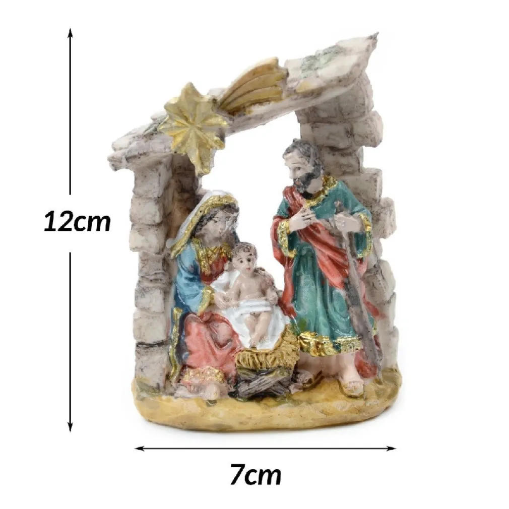 Realizzata interamente in resina con la rappresentazione di Gesù bambino, Maria e Giuseppe.