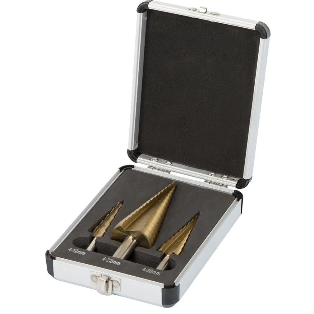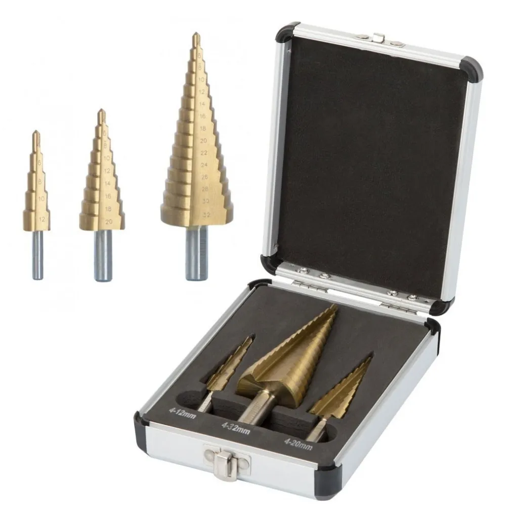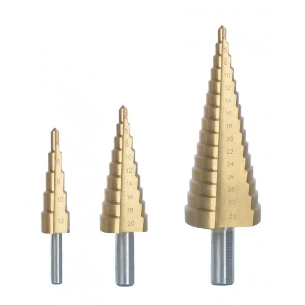 Punte in acciaio HSS placcate in titanio per aumentarne la resistenza. Studiate in modo speciale per la lavorazione di materiali friabili (da 5 a 7 mm a seconda del modello) o per effettuare dei fori guida. Permettono di effettuare forature rapide e progressive di diametri diversi. Capaci di forare la maggior parte dei materiali : metallo, legno, plastica , acciaio…