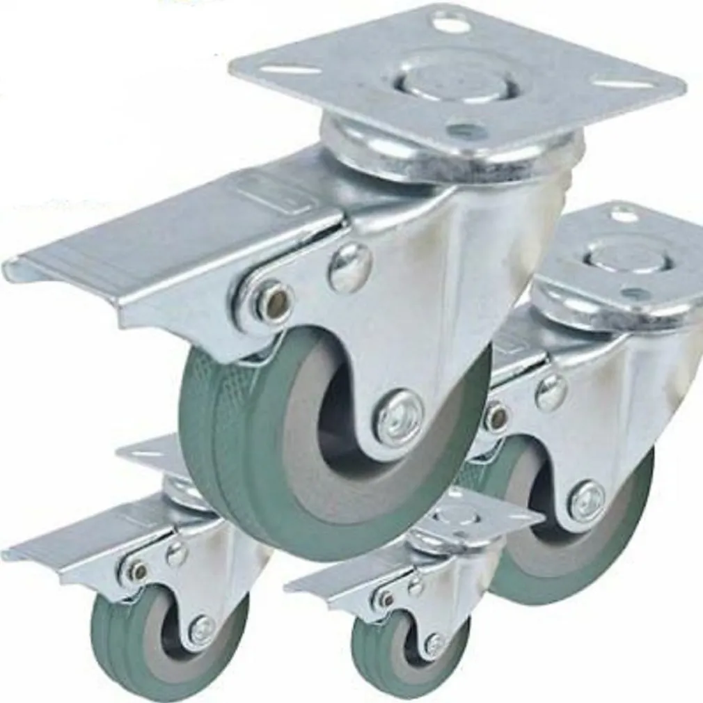 Ruota gommata con piastra girevole provvista di freno di varie misure per mobili, mobiletti, carrelli, accessori mobili e arredo casa, giardino e bricolage. Rivestimento in gomma rigida con blocco. Dotata di freno che blocca sia la ruota che la piastra girevole.