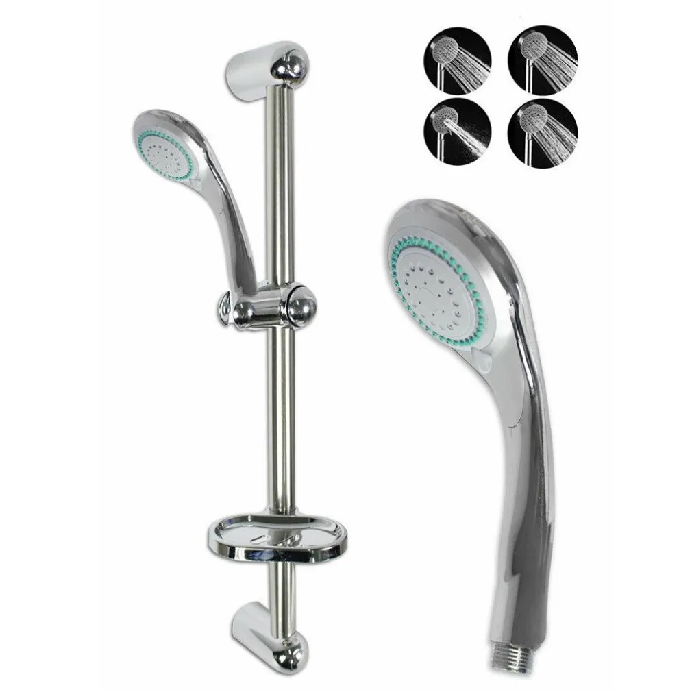 Saliscendi cromato con soffione dotato di ghiera girevole da cui potrete scegliere di volta in volta che tipo di gettata desiderate. Semplice da montare e da pulire, la linea moderna ed essenziale lo rende adatto a qualsiasi stile di bagno. Fornito con tubo flessibile per il soffione, un comodo portasapone scorrevole e viti per il fissaggio.