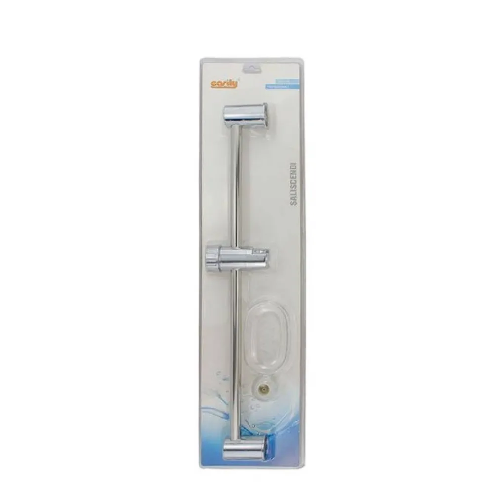 Saliscendi per soffione da doccia con supporto orientabile e regolabile in altezza grazie alla manopola facendolo scorrere sull’asta. Dispone di un pratico portasapone in plastica.
