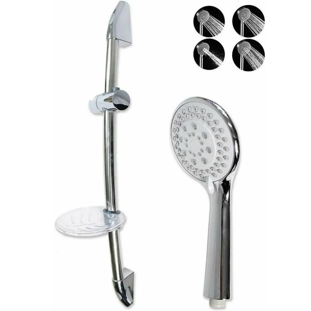 Saliscendi da doccia con soffione multi getto dal diametro di 10 cm dotato di supporto orientabile e regolabile in altezza grazie al tasto facendolo scorrere sull’asta. Dispone di un pratico portasapone in plastica.