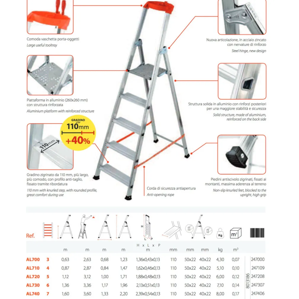 - Prodotto certificato secondo la normativa EN131, rilasciata da un Ente abilitato europeo, portata garantita 150 kg