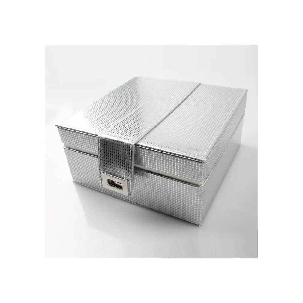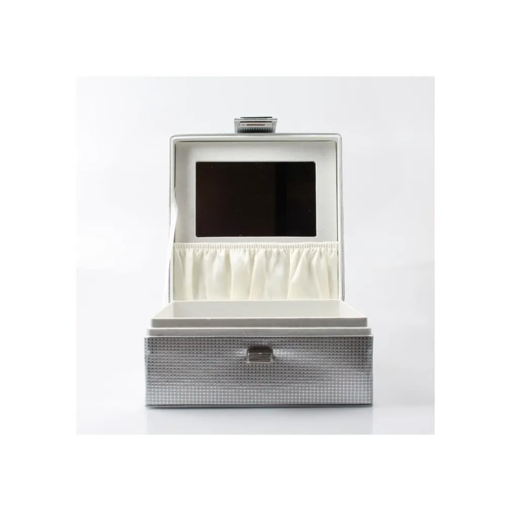Elegante e pratica scatola porta oggetti dal design accattivante da esporre su comò, mobili o in bagno. Grazie al suo cassetto estraibile e allo specchio interno la rende molo capiente e comoda anche per truccarsi. Tantissimi scomparti per riporre trucco, gioielli e oggetti vari. Realizzata in similpelle con dimensione 17 x 17 x 8 cm di colore bianco.