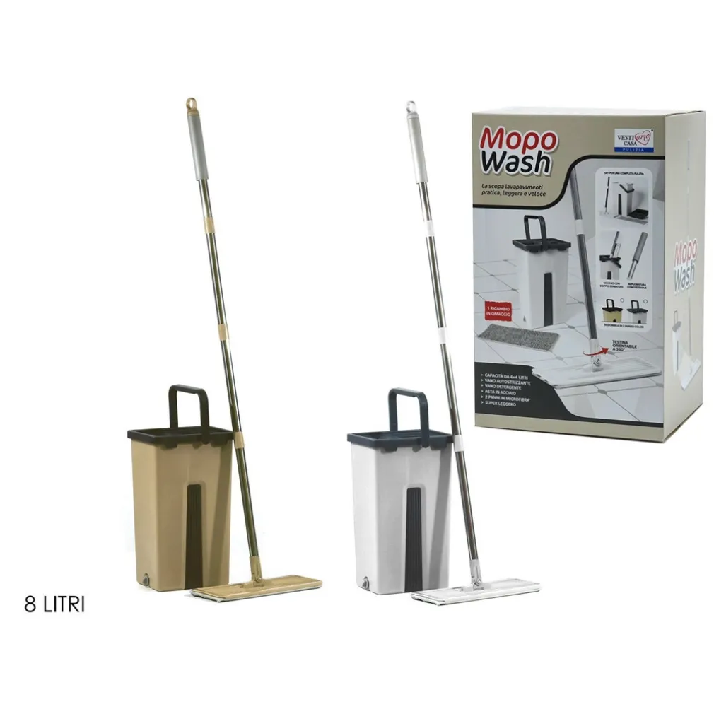 Riceverai un secchio doppio serbatoio da 8 LT, un bastone estensibile in acciaio, due panni lavabili e un vano detergente integrato.