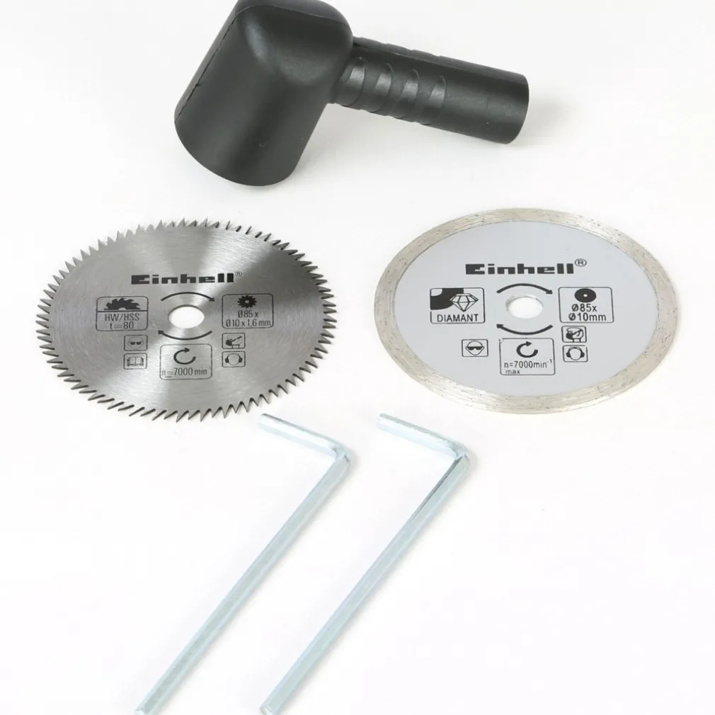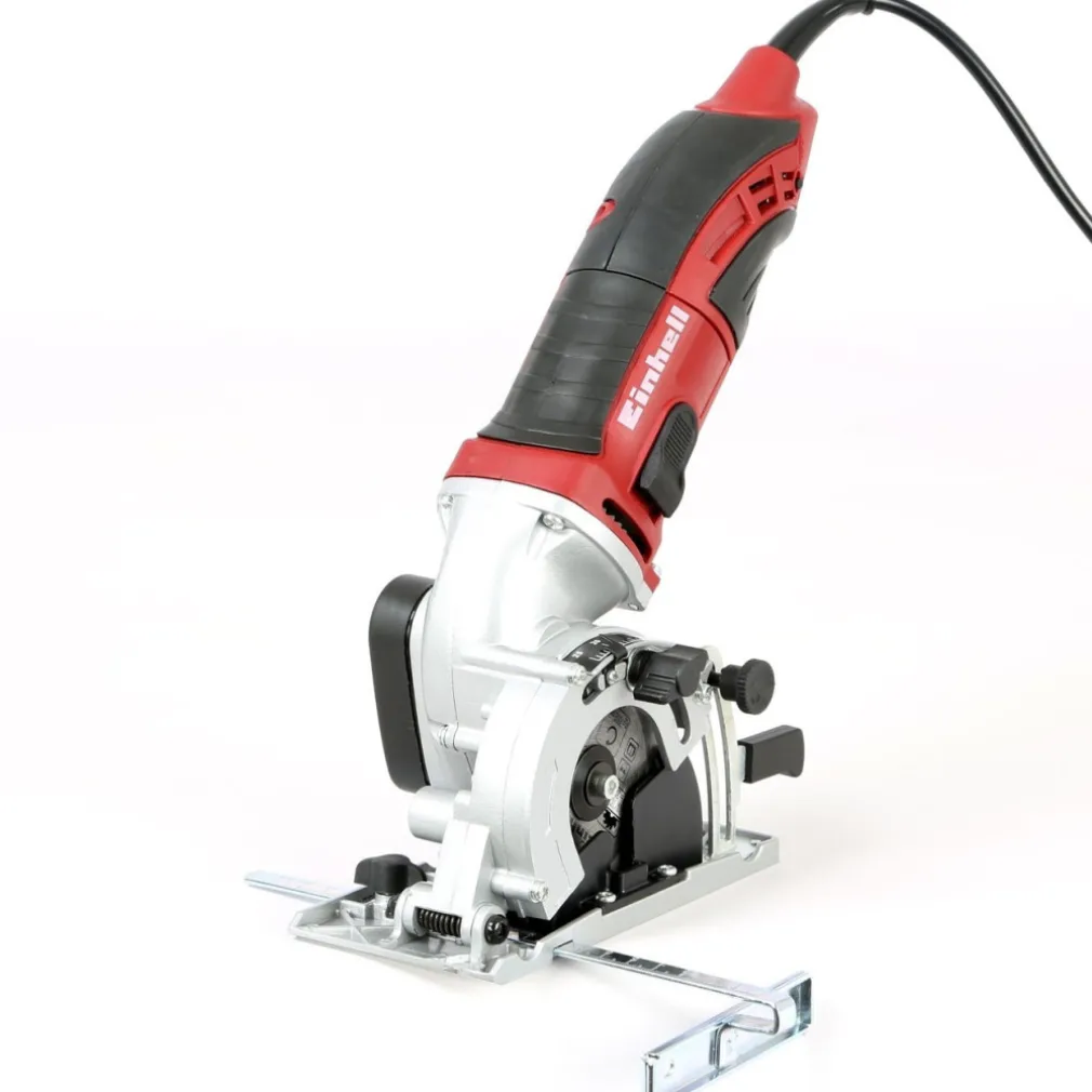 La sega circolare mini Einhell TC-CS 860 è un utensile indispensabile nell’officina personale di chiunque si diverta con l’hobbistica e il “fai da te”. Particolarmente maneggevole e semplice da utilizzare, questa sega è adatta per tagliare legno, compensato, piastrelle e materie plastiche: è dotata di un kit dischi dalla diversa funzione e qualità che vi aiuteranno ad eseguire una serie infinita di piccoli lavori con tanta soddisfazione. Il comando di accensione è inserito nell’impugnatura rivestita in gomma antiscivolo, il vano porta disco può essere aperto facilmente per il cambio della lama ed il taglio è regolabile in continuo grazie all’asta graduata registrabile con la manopola laterale, mentre la guida parallela assicura tagli netti e precisi. Il motore elettrico da 450 W ha la protezione da eventuali sovraccarichi di tensione e può essere allacciato a qualsiasi presa di corrente domestica da 230 V. Questo utensile ha un adattatore per l’aspirazione delle polveri per consentire di avere sempre il piano di lavoro pulito.
