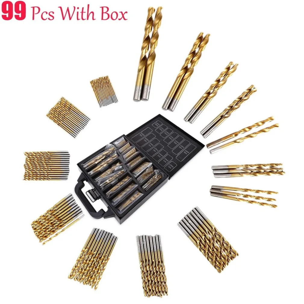 Pratico e comodo set per professionisti e amanti del fai da te composto da ben 99 punte professionali HSS per trapano per fori su alluminio, legno, ferro.
