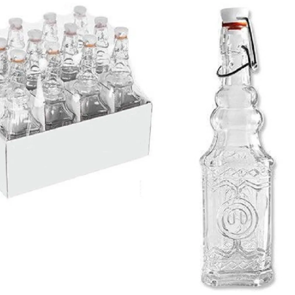 Acquista ora il tuo set di 12 bottiglie in vetro trasparente quadrata con tappo meccanico e porta un tocco di eleganza e praticità nella tua casa.