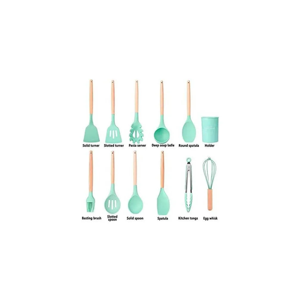 Cosa include il set di utensili? Il set include 12 utensili da cucina in silicone con manico in legno, progettati per tutte le tue esigenze di cottura e imbastitura.