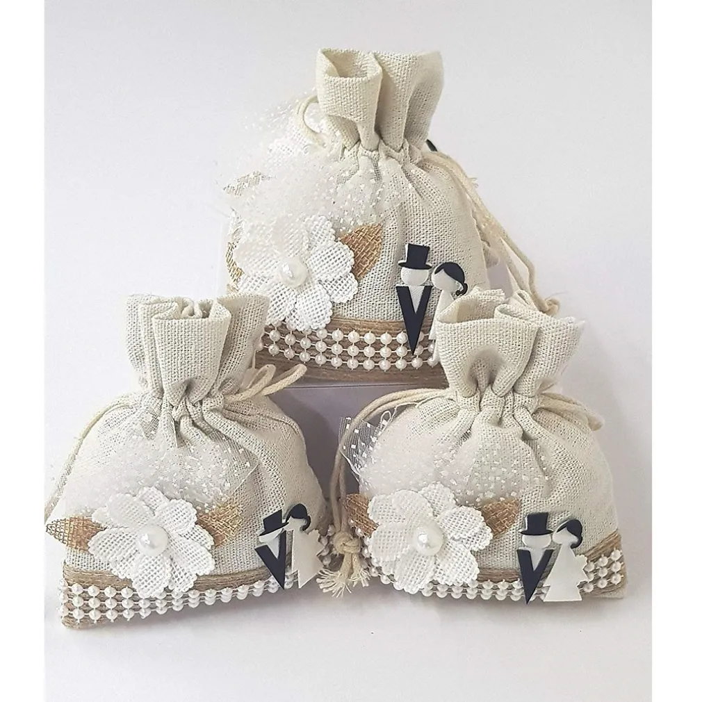 Realizzati con juta di alta qualità, questi sacchetti presentano un design delicato impreziosito da fiori e perline. Questi dettagli decorativi conferiscono loro un aspetto distintivo e unico, perfetto per complementare qualsiasi tema di matrimonio o evento.