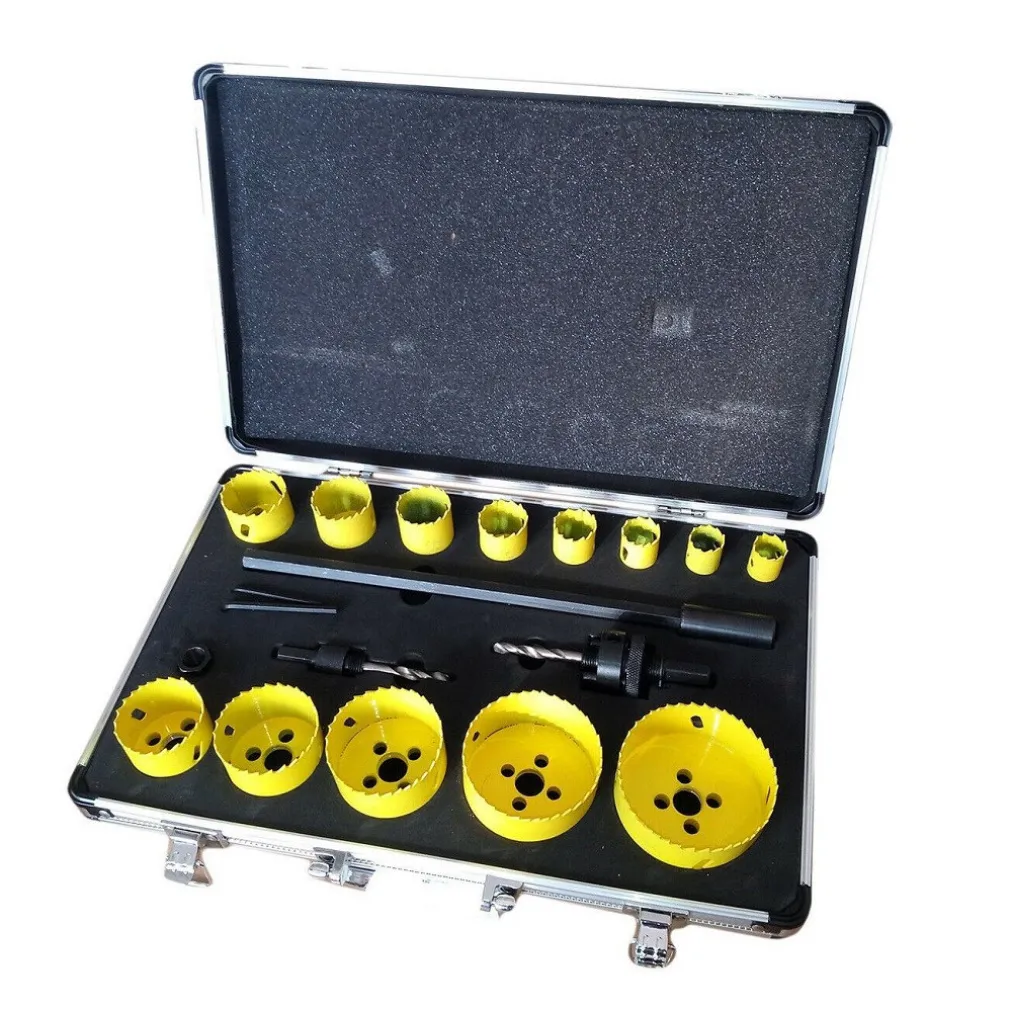 Nuovissimo set di frese a tazza con tutti gli accessori per il loro utilizzo. Ideali sia per falegnami ma anche come set da avere a portata di mano nel vostro garage per i vostri piccoli lavoretti e il fai da te. Il set contiene 13 frese a tazza composte in acciaio rigido HSS risultano ideali per la foratura in legno, plastica, metallo, cartongesso, vetroresina, pvc, compensato. Set frese a tazza nel formato da 19 mm (3/4 “) a 76mm (3”) di diametro. Inclusi due supporti per le frese da trapano, bullone, due chiavini e una prolunga da 30cm.Tutto il kit è fornito ordinatamente in una custodia. Ideali per eseguire i fori per il passaggio dei tubi, l’installazione di tubi di areazione, per interruttori e cassette di derivazione ad incasso.
