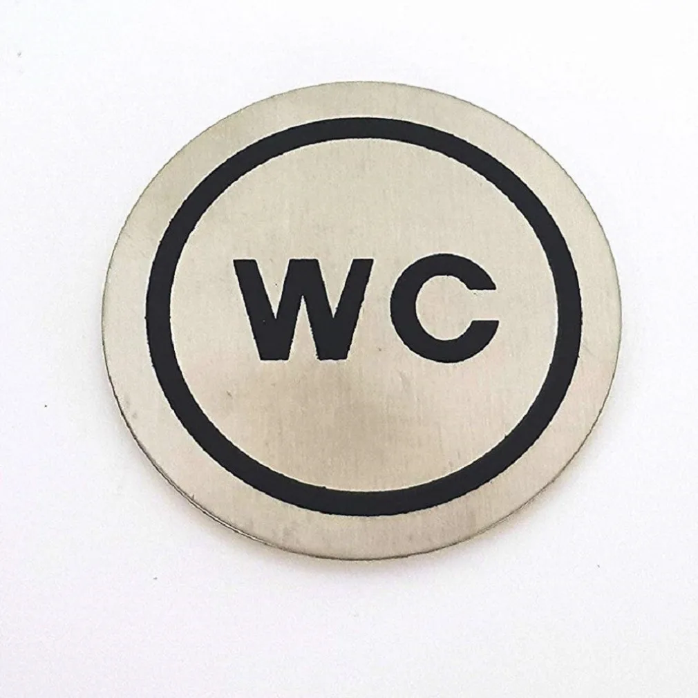 SET 2 PEZZI CARTELLI CARTELLO TONDO ADESIVO IN METALLO SCRITTA WC PORTA WC BAGNO TARGA TARGHETTA 6.5CM ADESIVA.