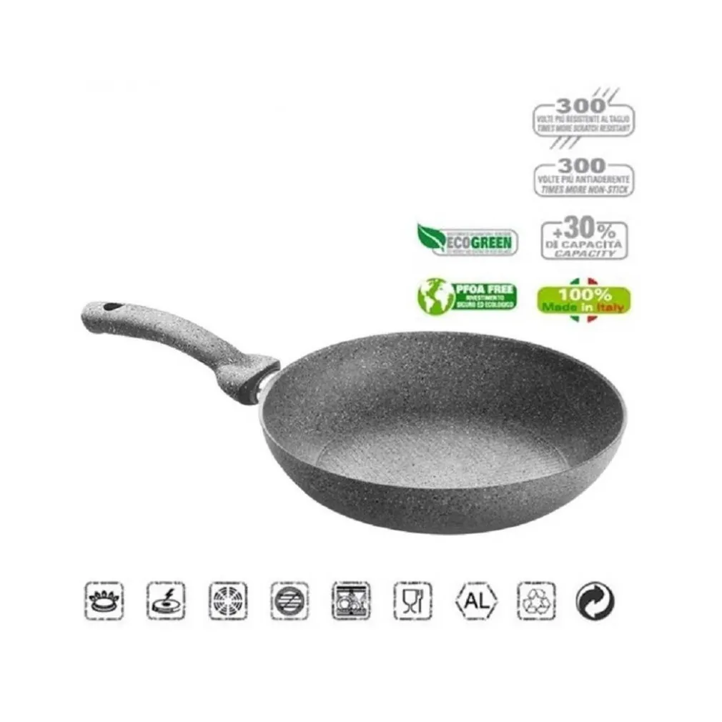 Corpo in alluminio puro al 99,5% ad alto spessore, forgiato per una perfetta diffusione del calore e una migliore cottura dei cibi. Rivestimento interno ed esterno AM Mineral STONE a effetto pietra costituito di una fitta rete di micro particelle minerali naturali, rinforzato con titanio, altamente antiaderente e resistente, sicuro ed ecologico. Fondo microrettificato antiscivolo, distribuisce il calore in modo uniforme, permettendo la cottura ideale e garantendo la perfetta planarita’ dell’utensile.