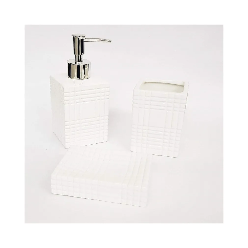 SET 3 PEZZI BAGNO BIANCO STRISCE QUADRI ESY_028 IN CERAMICA DESIGN DISPENSER SAPONE PORTA SAPONETTA BICCHIERE PORTA SPAZZOLINI.