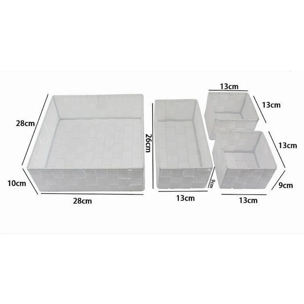 Il set include quattro contenitori in tessuto: uno grande quadrato, uno rettangolare e due piccoli quadrati.
