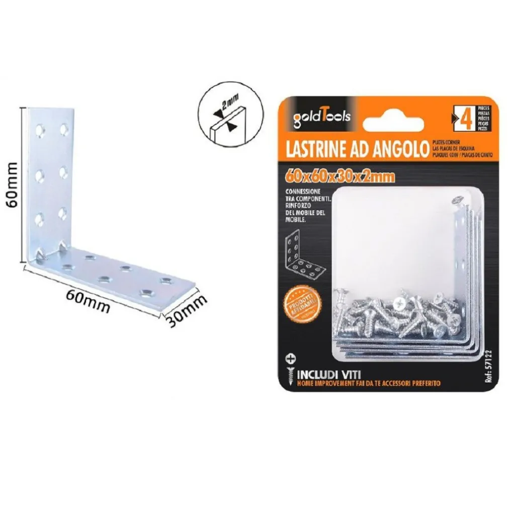 - Cosa include la confezione? La confezione include 4 pezzi di Lastrina ad angolo 60x60x30x2mm con viti per mobili, pronte all’uso.