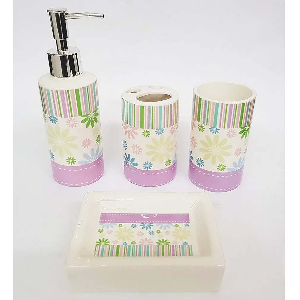 SET 4 PEZZI BAGNO STRISCE LILLA FLOREALE IN CERAMICA DESIGN DISPENSER SAPONE PORTA SAPONETTA BICCHIERE PORTA SPAZZOLINI.