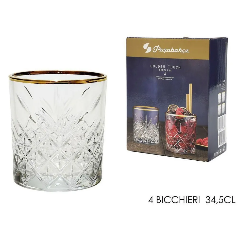 SET 4PZ BICCHIERE IN VETRO DESIGN ELEGANTE CON BORDINO DORATO 34,5CL PER WHISKY COCKTAIL