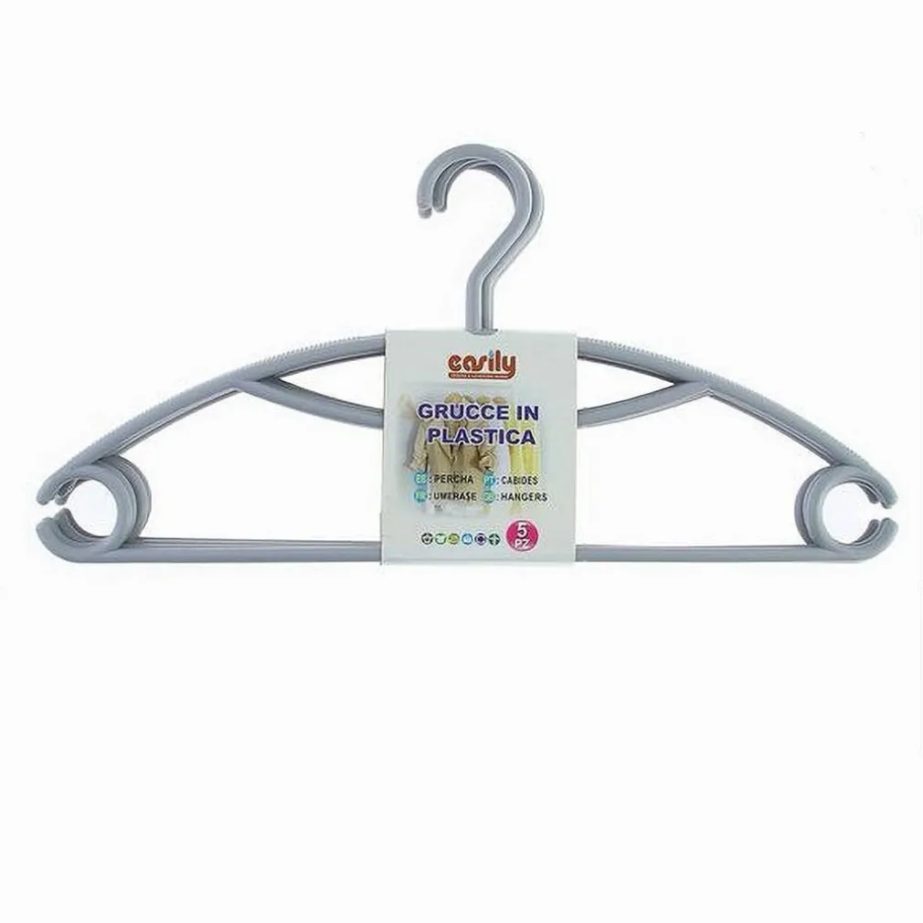 Il set include 5 grucce appendiabiti in plastica grigia, ciascuna della misura di 40 cm, ideali per appendere vestiti e pantaloni.