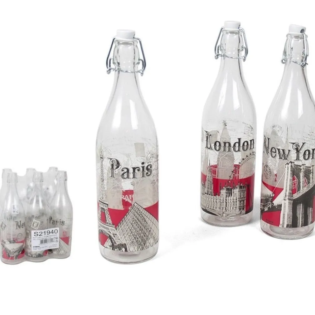 Set 6 Pezzi Bottiglie in Vetro Decorate “Cities” – Città del Mondo – Capacità 1 Litro