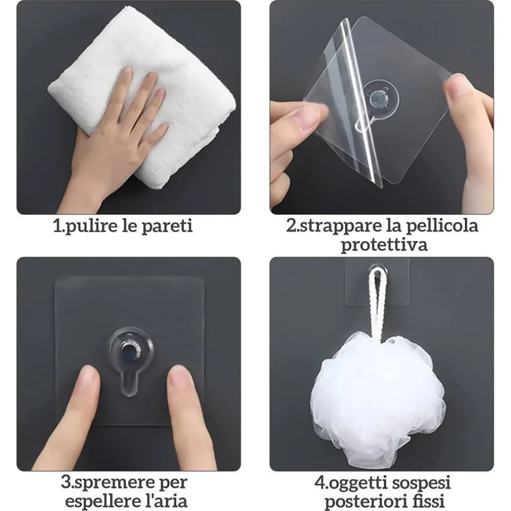 Ganci adesivi non necessita di foratura, non danneggia il muro e può essere applicato su tutti i tipi di superfici lisce.