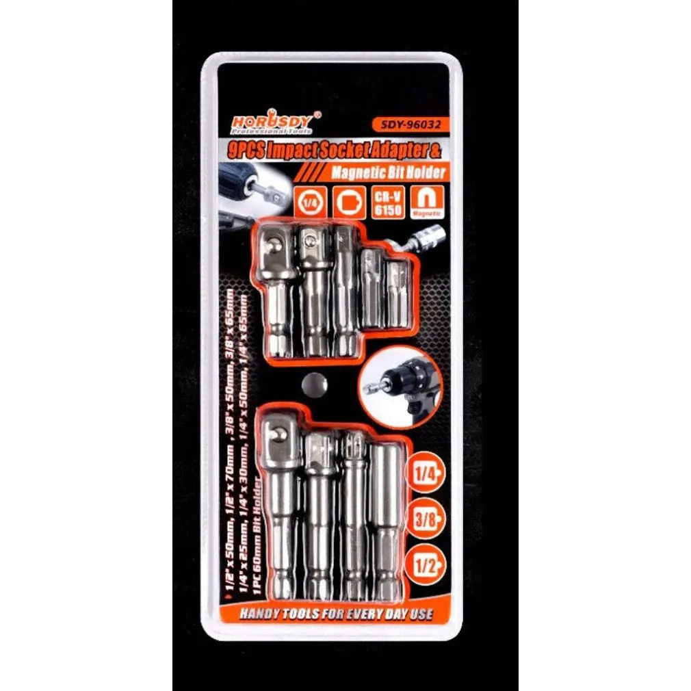 SET 9 ADATTATORI PER BUSSOLA 1/4″ 3/8″ 1/2″ PER AVVITATORE E TRAPANO SDY-96032