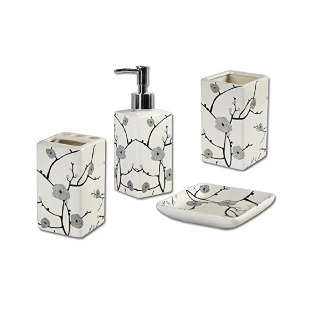 SET 4 PEZZI BAGNO FIORI PESCO GIAPPONESI ESY_063 IN CERAMICA DESIGN DISPENSER SAPONE PORTA SAPONETTA BICCHIERE PORTA SPAZZOLINI.