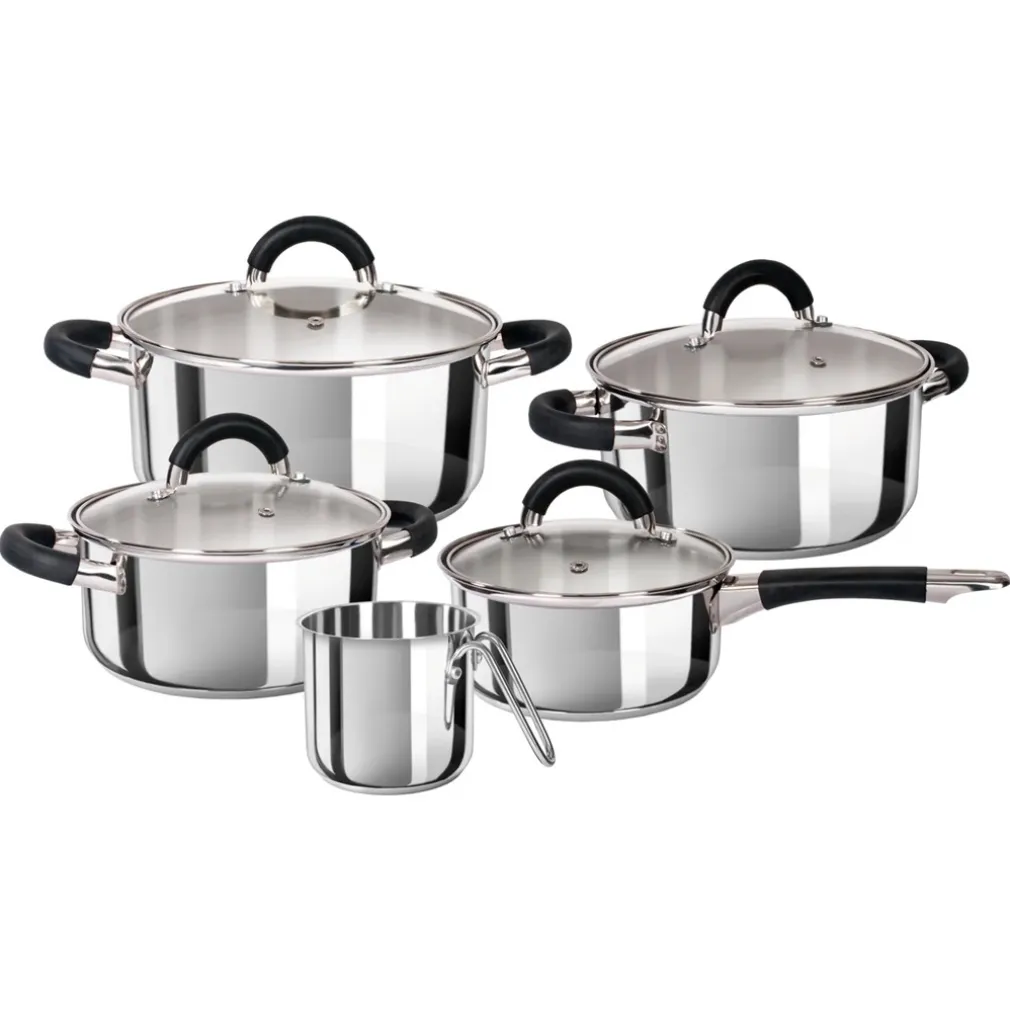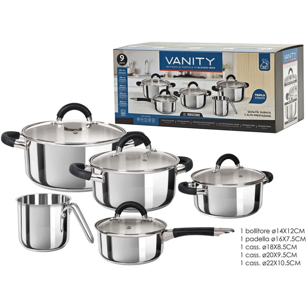 SET BATTERIA DI PENTOLE 9PZ PER INDUZIONE IN ACCIAIO TRIPLO STRATO CON COPERCHI IN VETRO